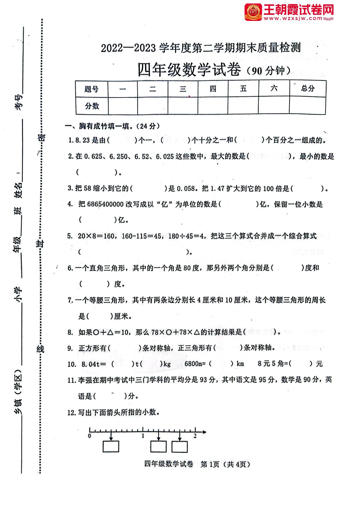 河北省秦皇岛市昌黎县2022-2023学年度第二学期期末质量检测试卷四年级数学(人教版)