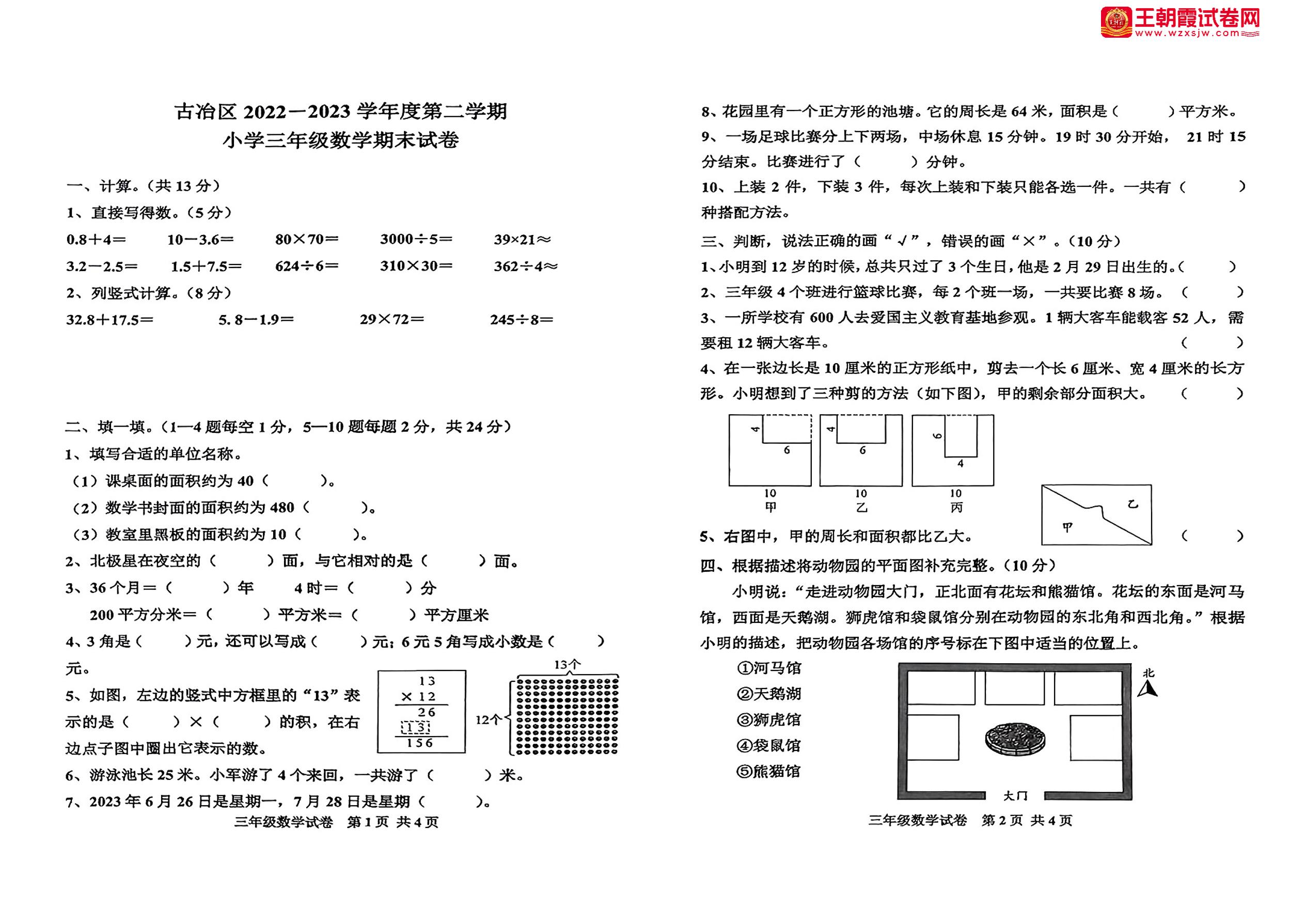 河北省唐山市古冶区2022-2023学年度第二学期期末试卷三年级数学(人教版)