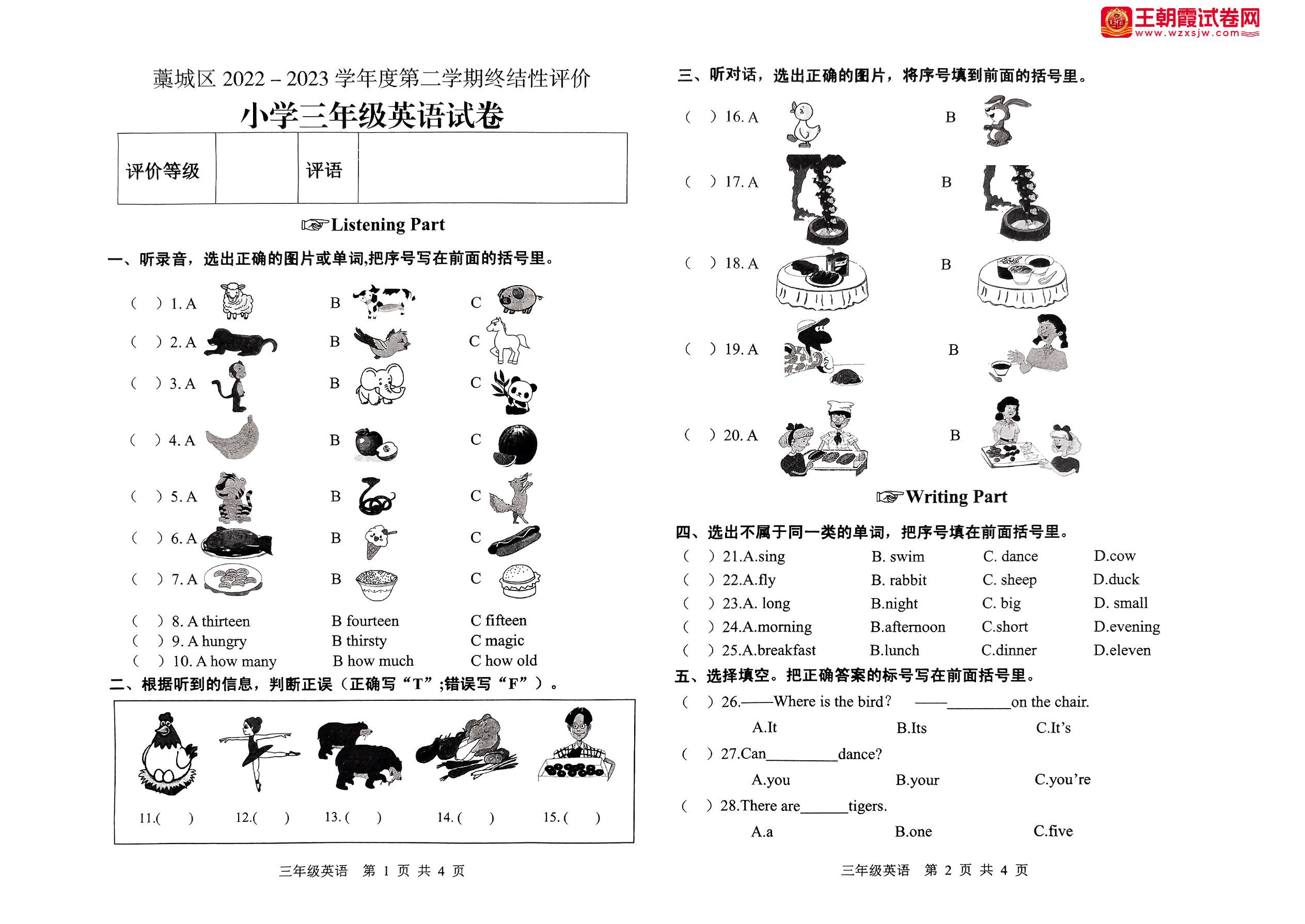 河北省石家庄市藁城区2022-2023学年度第二学期终结性评价试卷三年级英语(冀教版)【无听力音频】