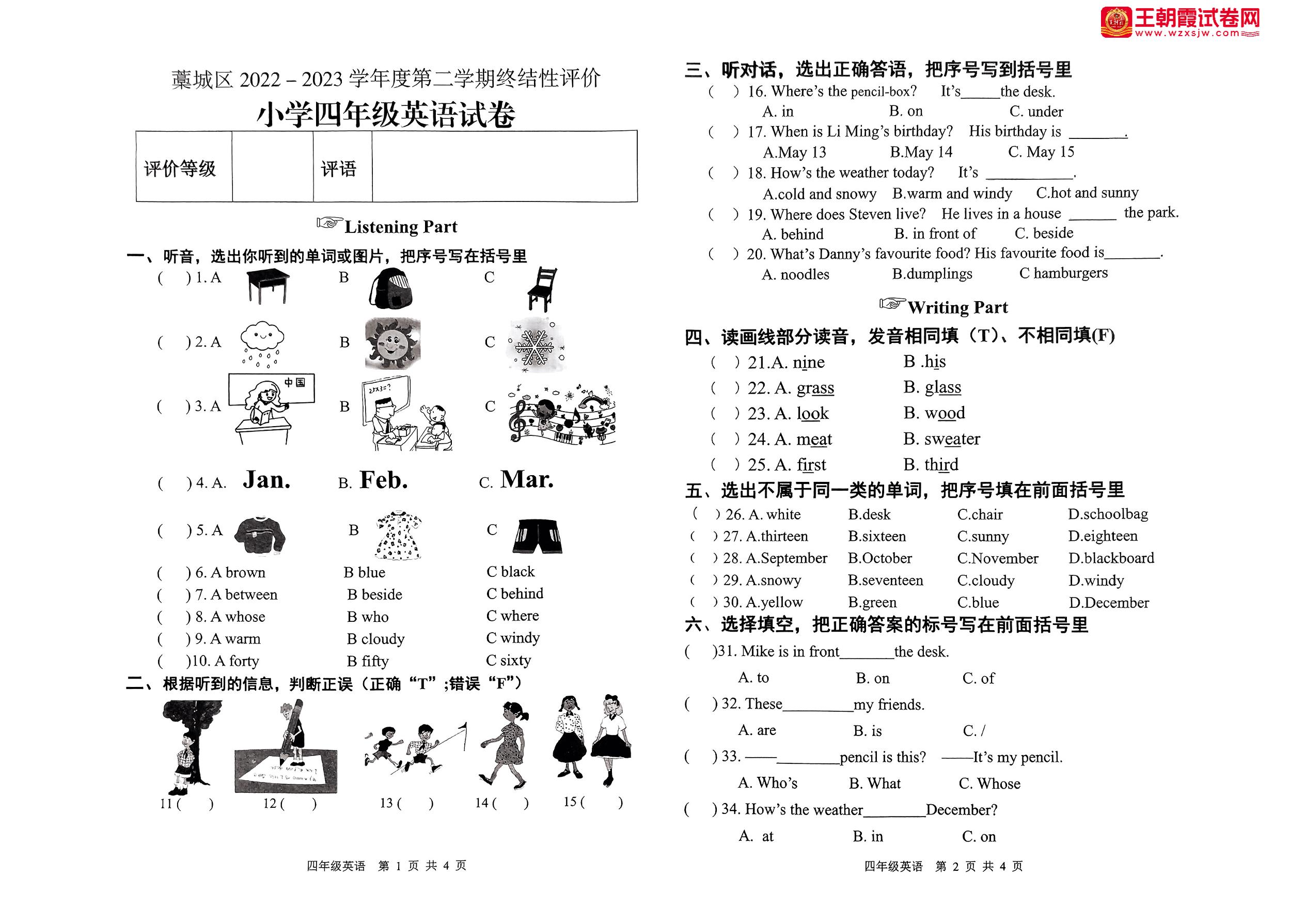 河北省石家庄市藁城区2022-2023学年度第二学期终结性评价试卷四年级英语(冀教版)【无听力音频】