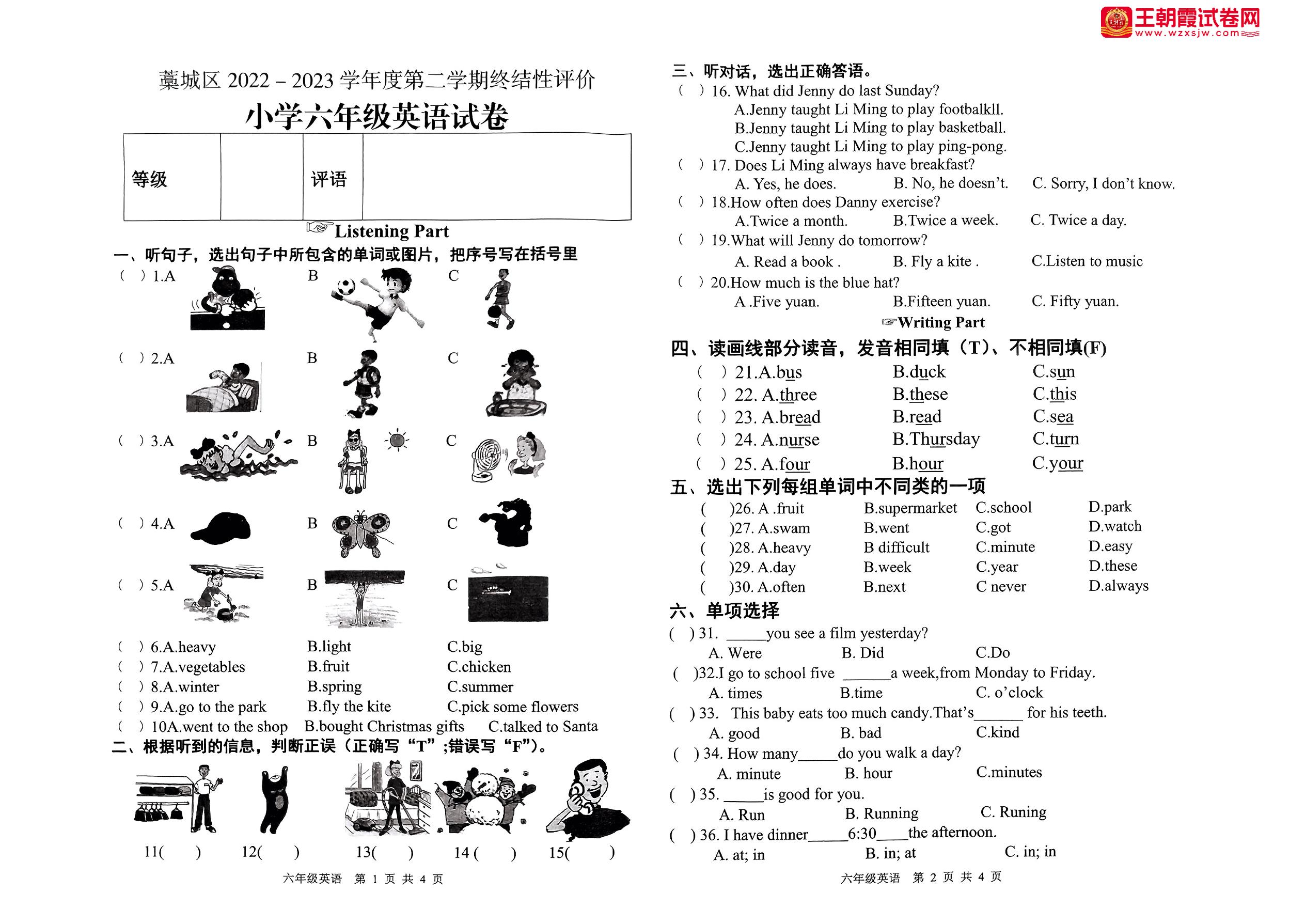 河北省石家庄市藁城区2022-2023学年度第二学期终结性评价试卷六年级英语(冀教版)【无听力音频】