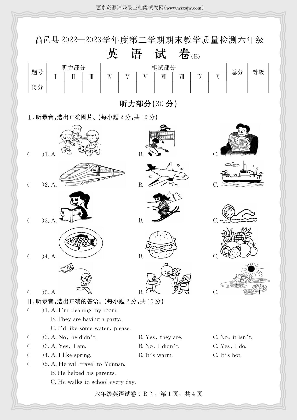 河北省石家庄市高邑县2022-2023学年度第二学期期末教学质量检测试题六年级英语(冀教版)