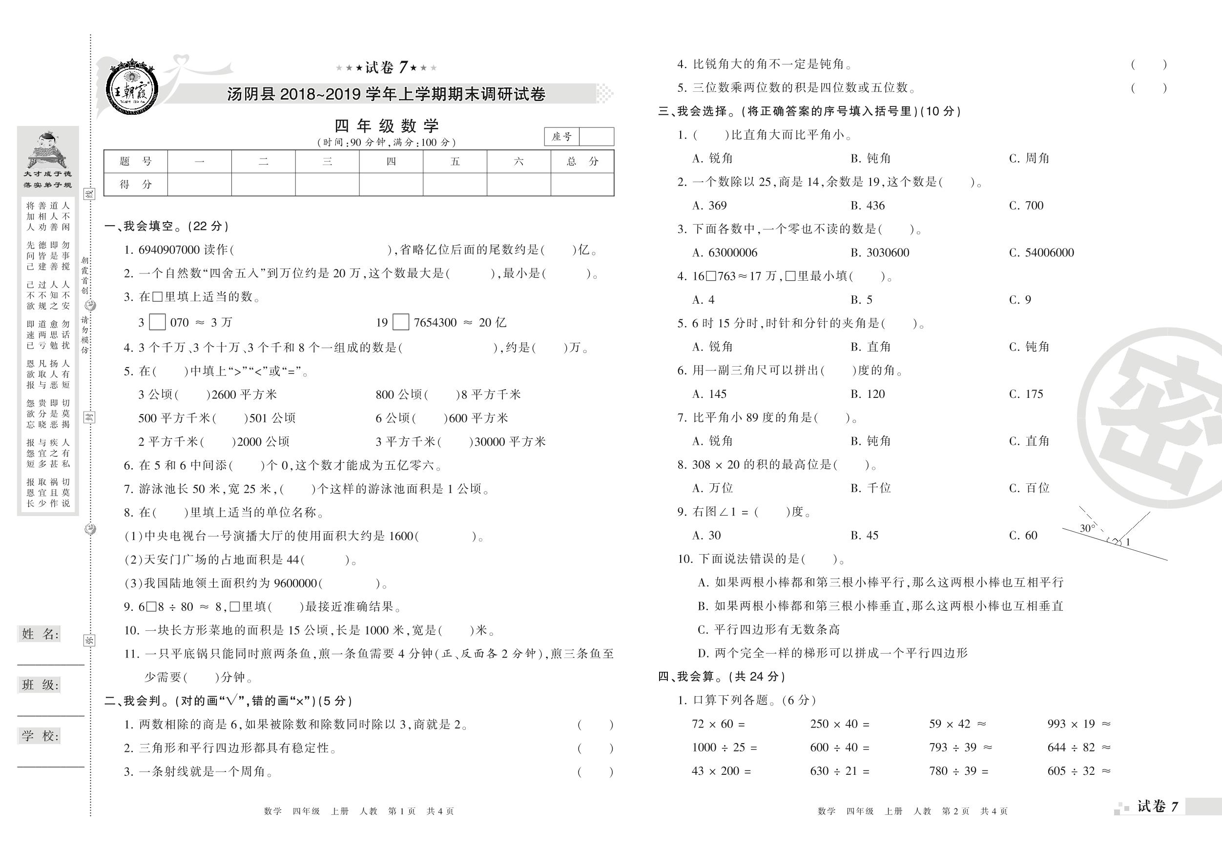 2018-2019学年第一学期安阳市汤阴县四年级数学试卷(人教版)【7】
