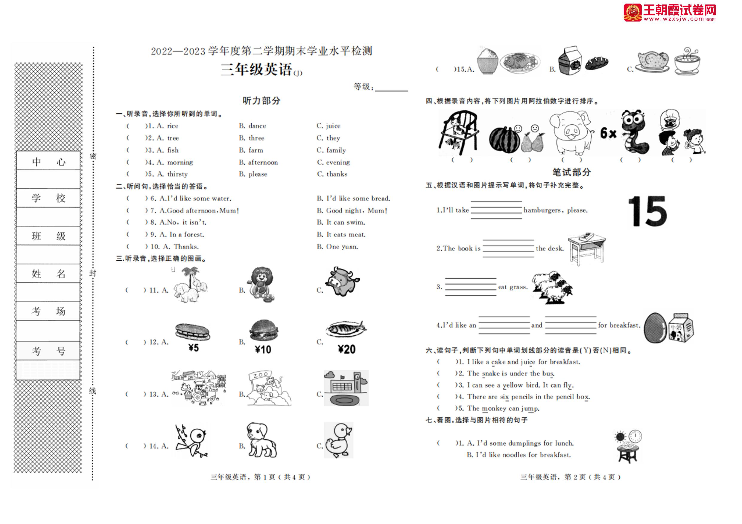 河北省石家庄市灵寿县2022-2023学年第二学期期末学业水平检测试题三年级英语(冀教版)