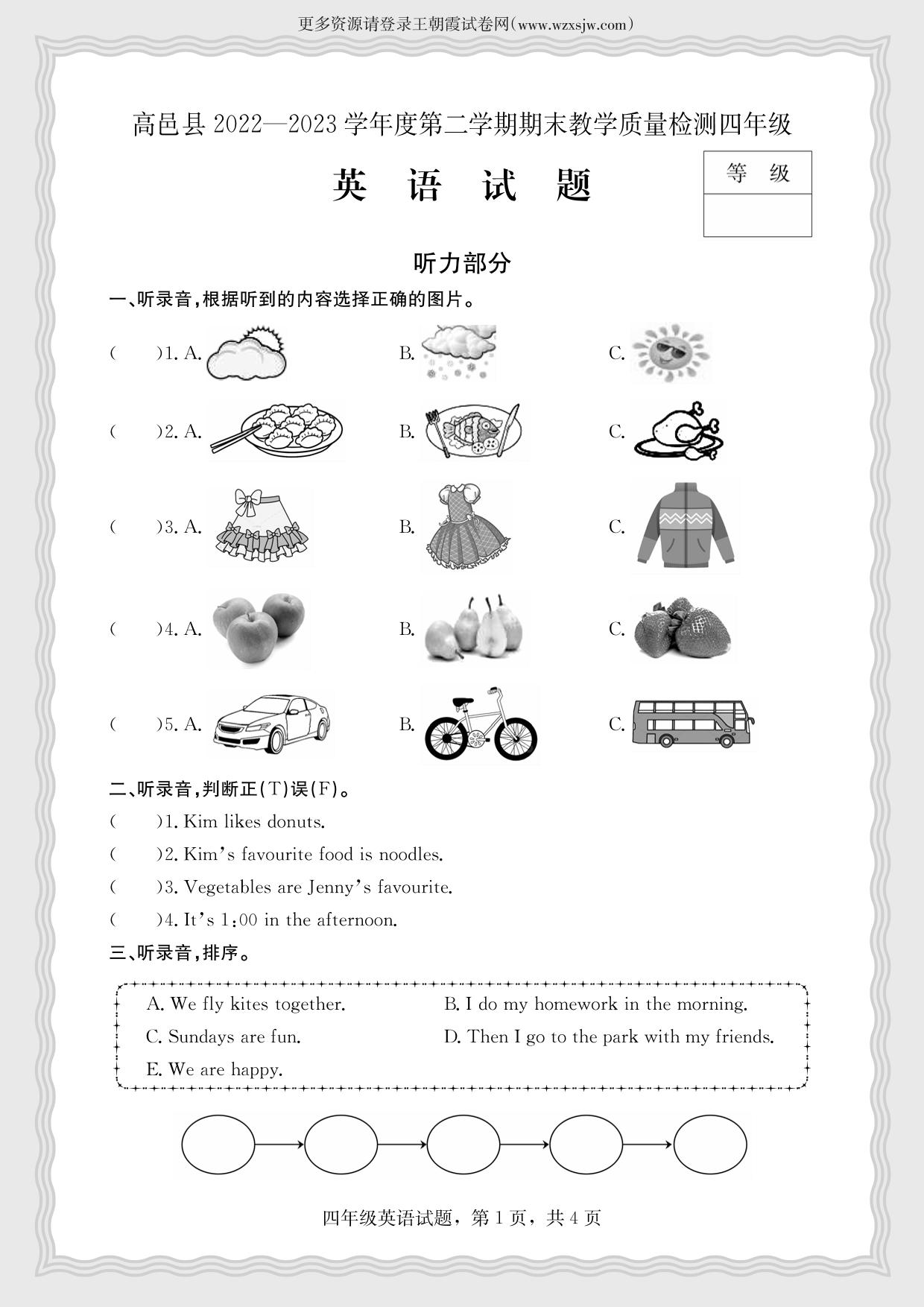 河北省石家庄市高邑县2022-2023学年度第二学期期末教学质量检测试题四年级英语(冀教版)