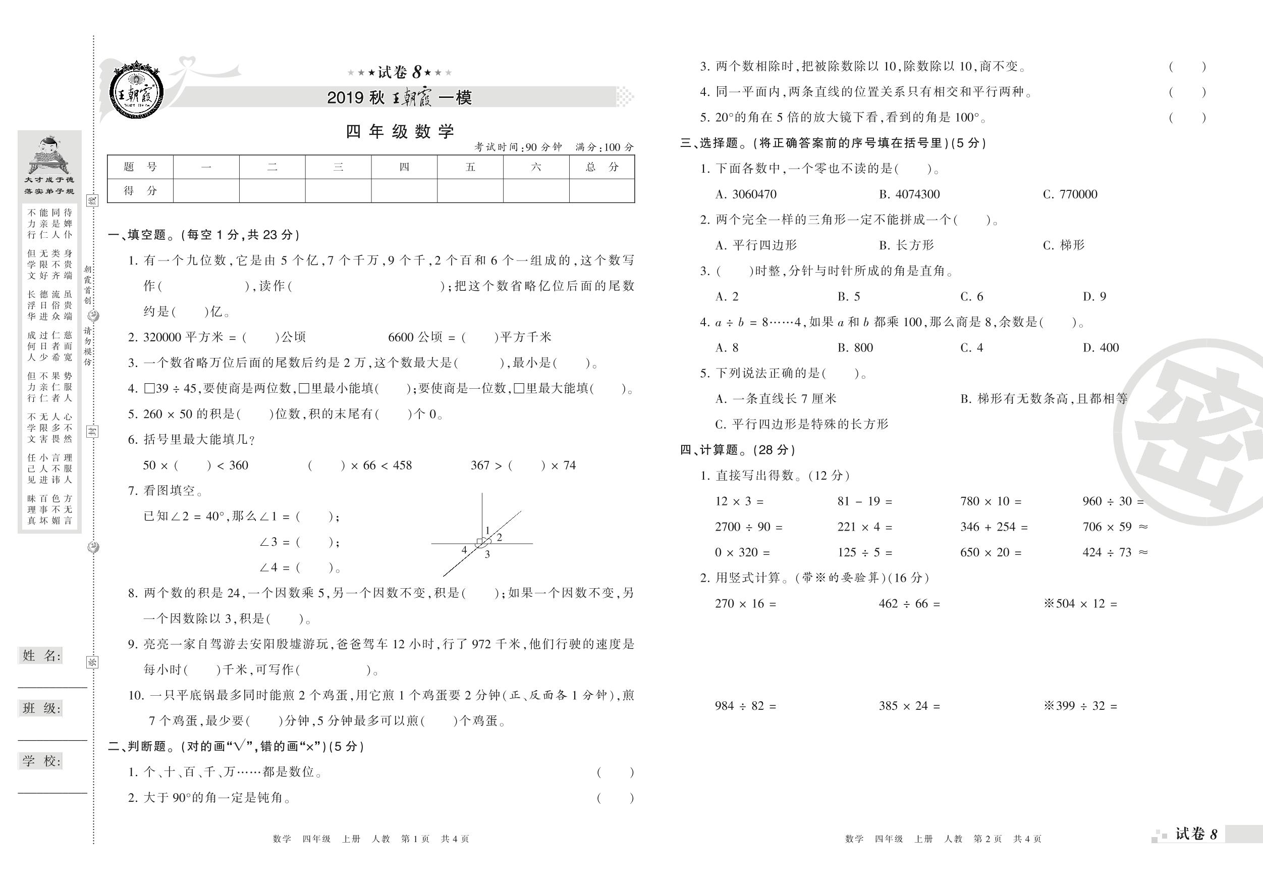 王朝霞期末模拟卷四年级上册数学(人教版)_R210804145351【8】