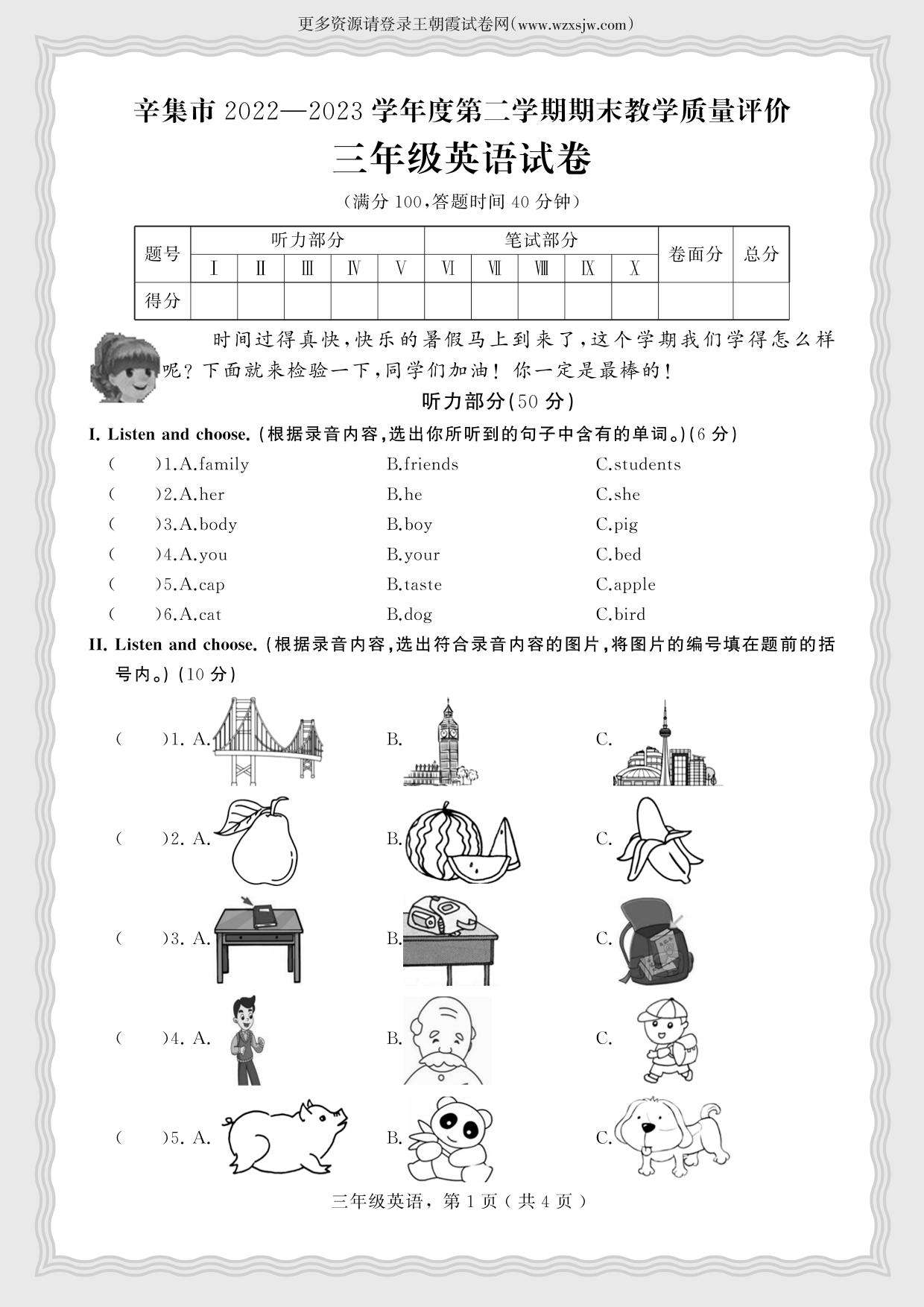 河北省石家庄市辛集市2022-2023学年度第二学期期末教学质量评价试卷三年级英语(人教PEP版)