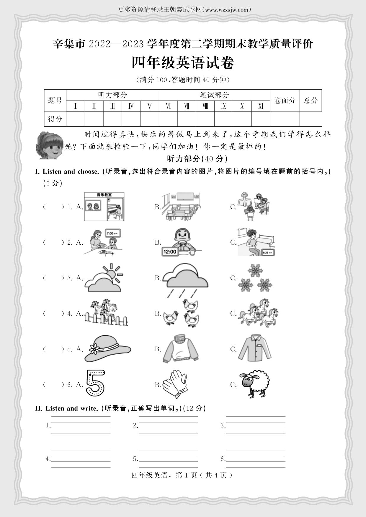 河北省石家庄市辛集市2022-2023学年度第二学期期末教学质量评价试卷四年级英语(人教PEP版)