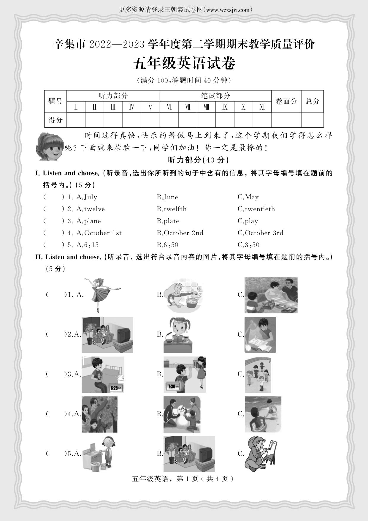 河北省石家庄市辛集市2022-2023学年度第二学期期末教学质量评价试卷五年级英语(人教PEP版)