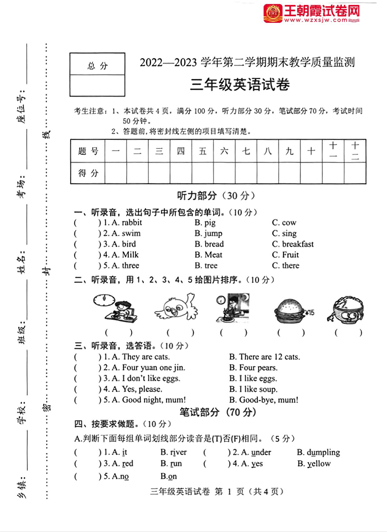 河北省保定市满城区2022-2023学年第二学期期末教学质量监测试卷三年级英语(冀教版)