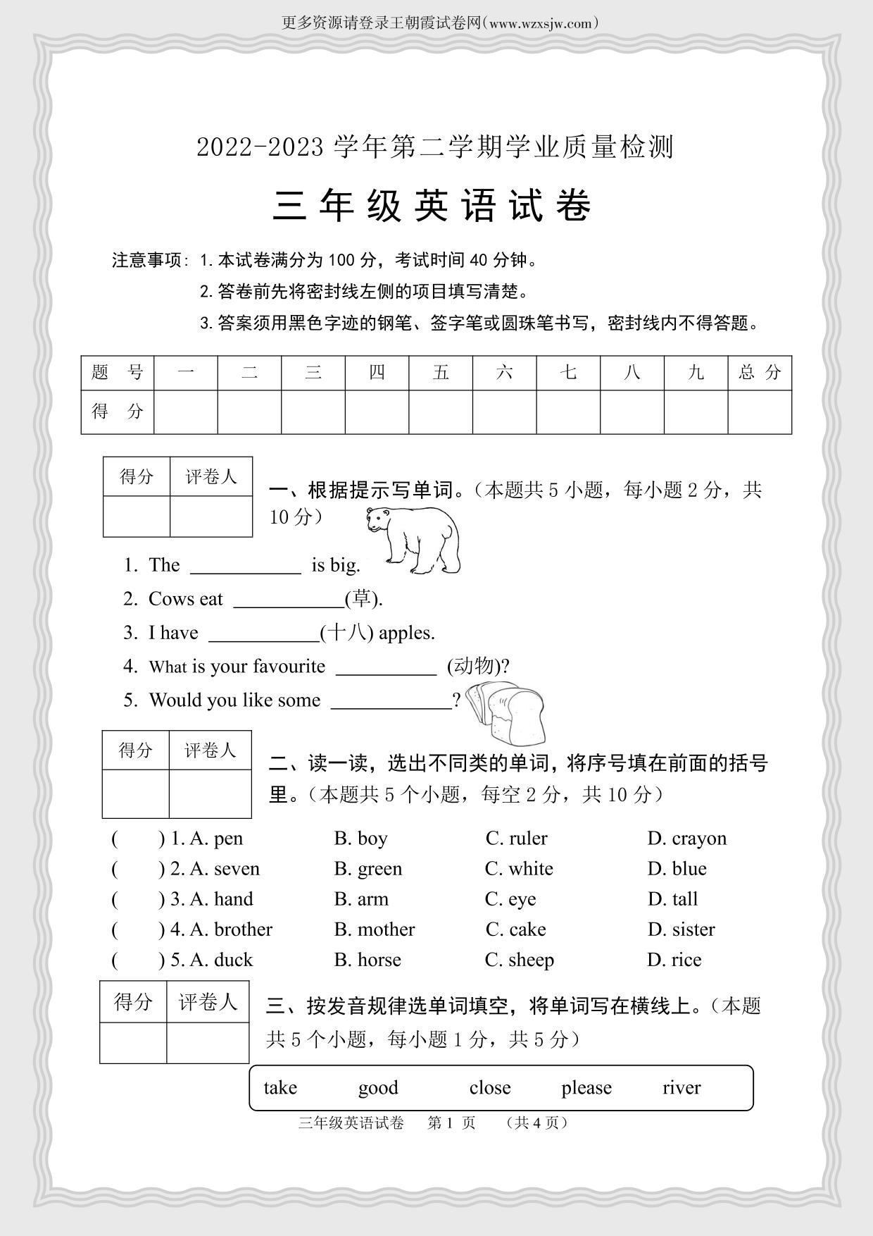 河北省保定市唐县2022-2023学年第二学期期末学业质量检测试卷三年级英语(冀教版)
