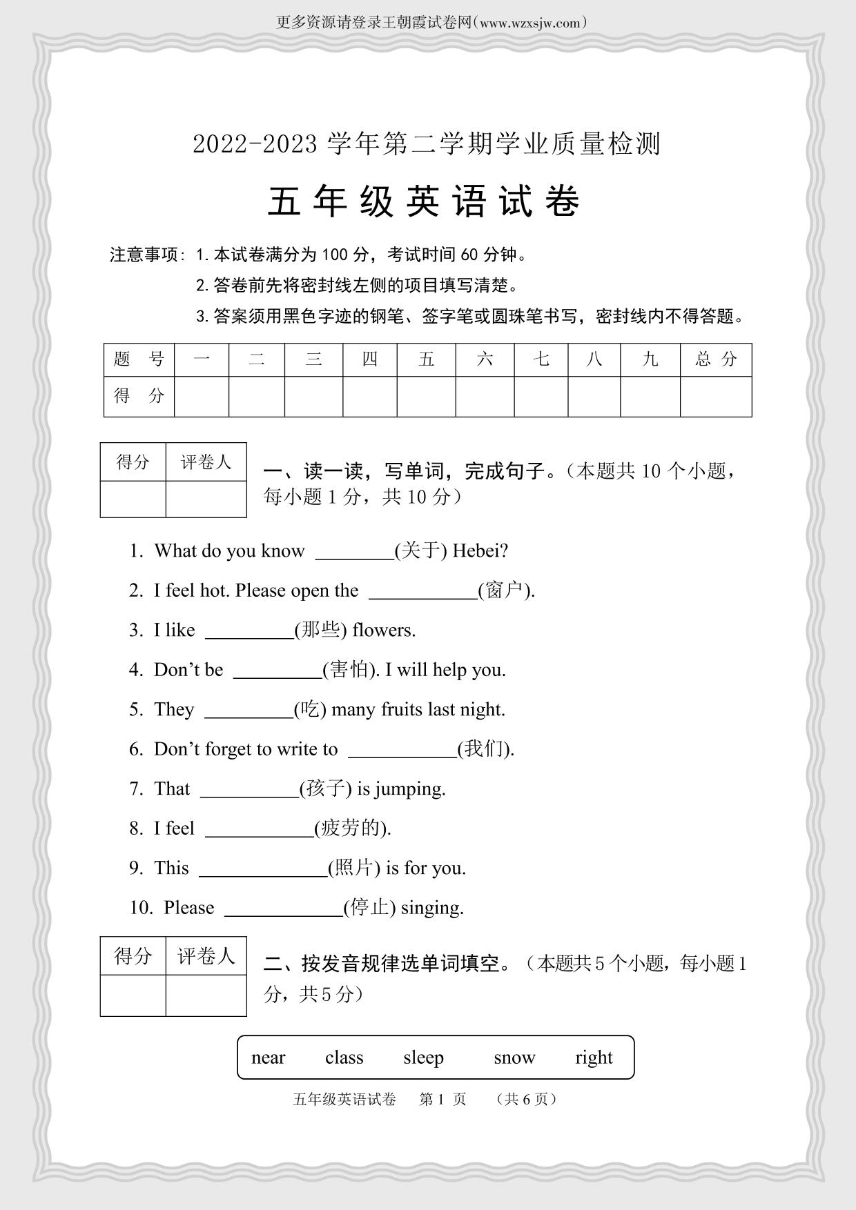 河北省保定市唐县2022-2023学年第二学期期末学业质量检测试卷五年级英语(冀教版)