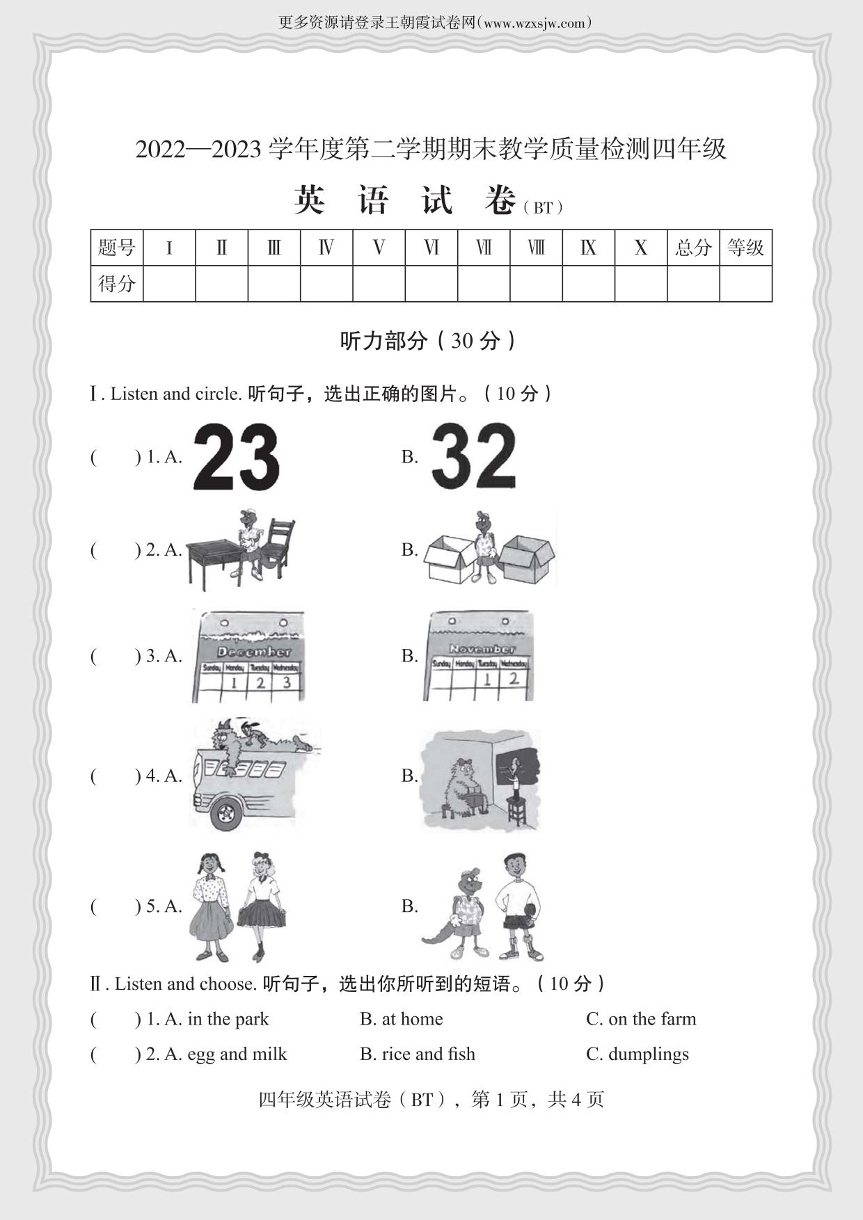 河北省沧州市泊头市2022-2023学年度第二学期期末教学质量检测试卷四年级英语(冀教版)【无听力音频】