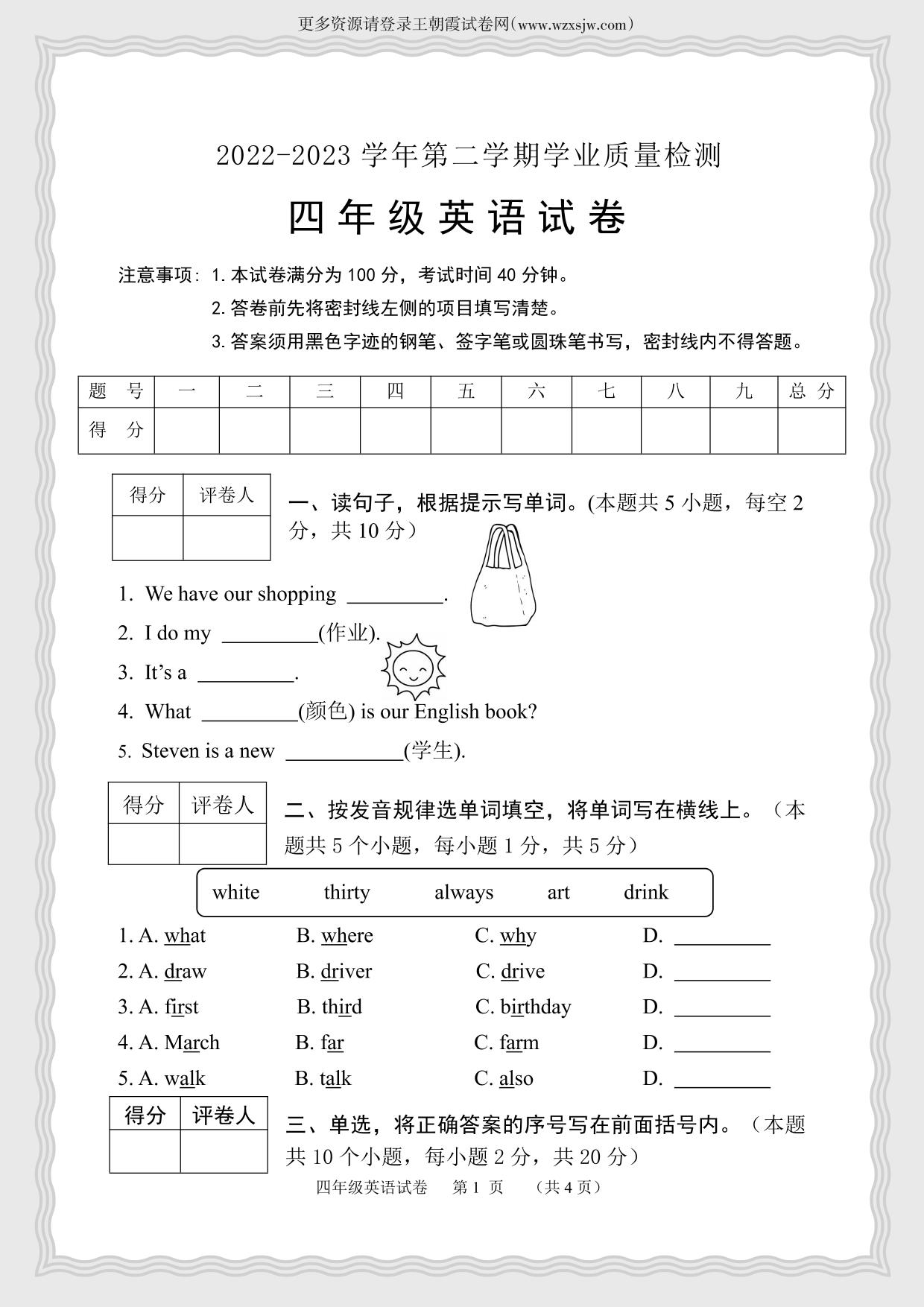 河北省保定市唐县2022-2023学年第二学期期末学业质量检测试卷四年级英语(冀教版)