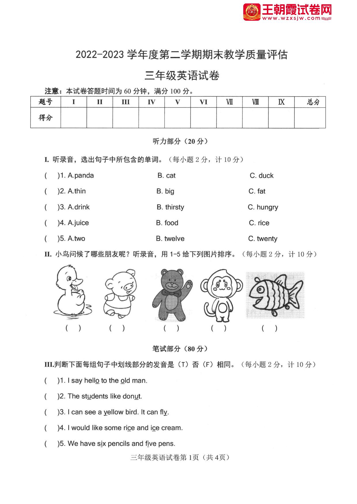 三年级英语冀教版下册期末卷