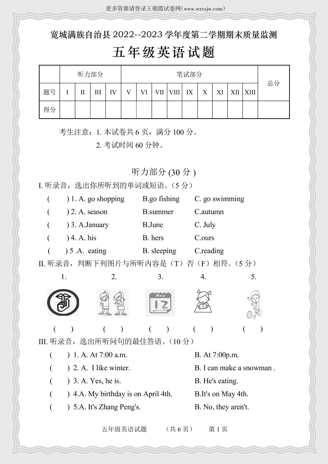 河北省承德市宽城满族自治县2022-2023学年度第二学期期末质量监测试题五年级英语(人教PEP版)
