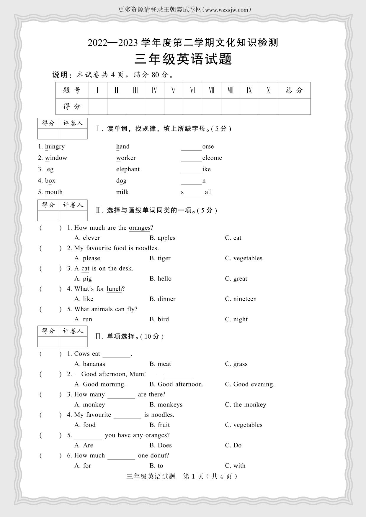 河北省邯郸市邱县2022-2023学年第二学期期末文化知识检测试题三年级英语(冀教版)