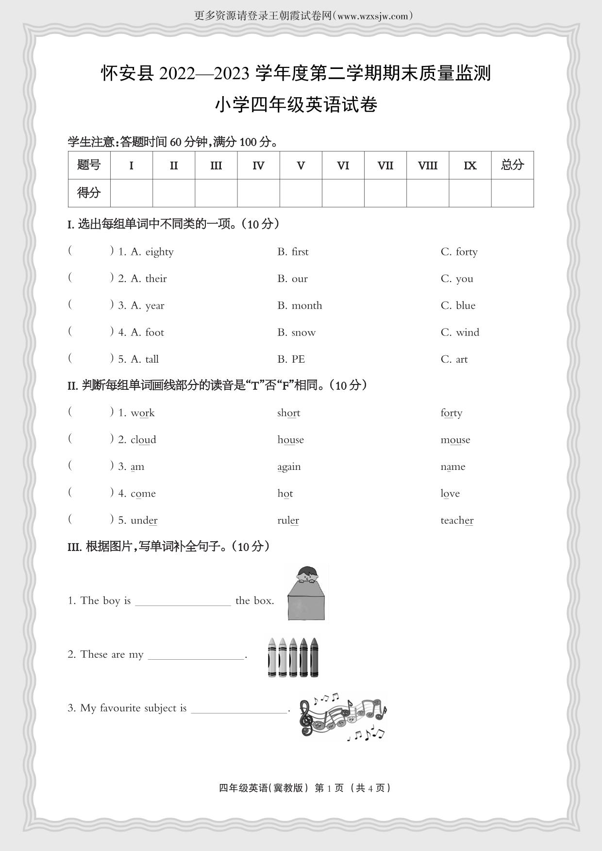河北省张家口市怀安县2022-2023学年度第二学期期末质量检测试卷四年级英语(冀教版)