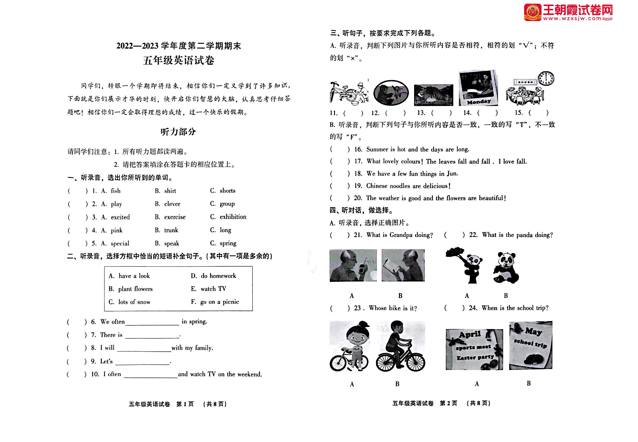 河北省廊坊市三河市2022-2023学年度第二学期期末试卷五年级英语(人教PEP版)【无听力音频】