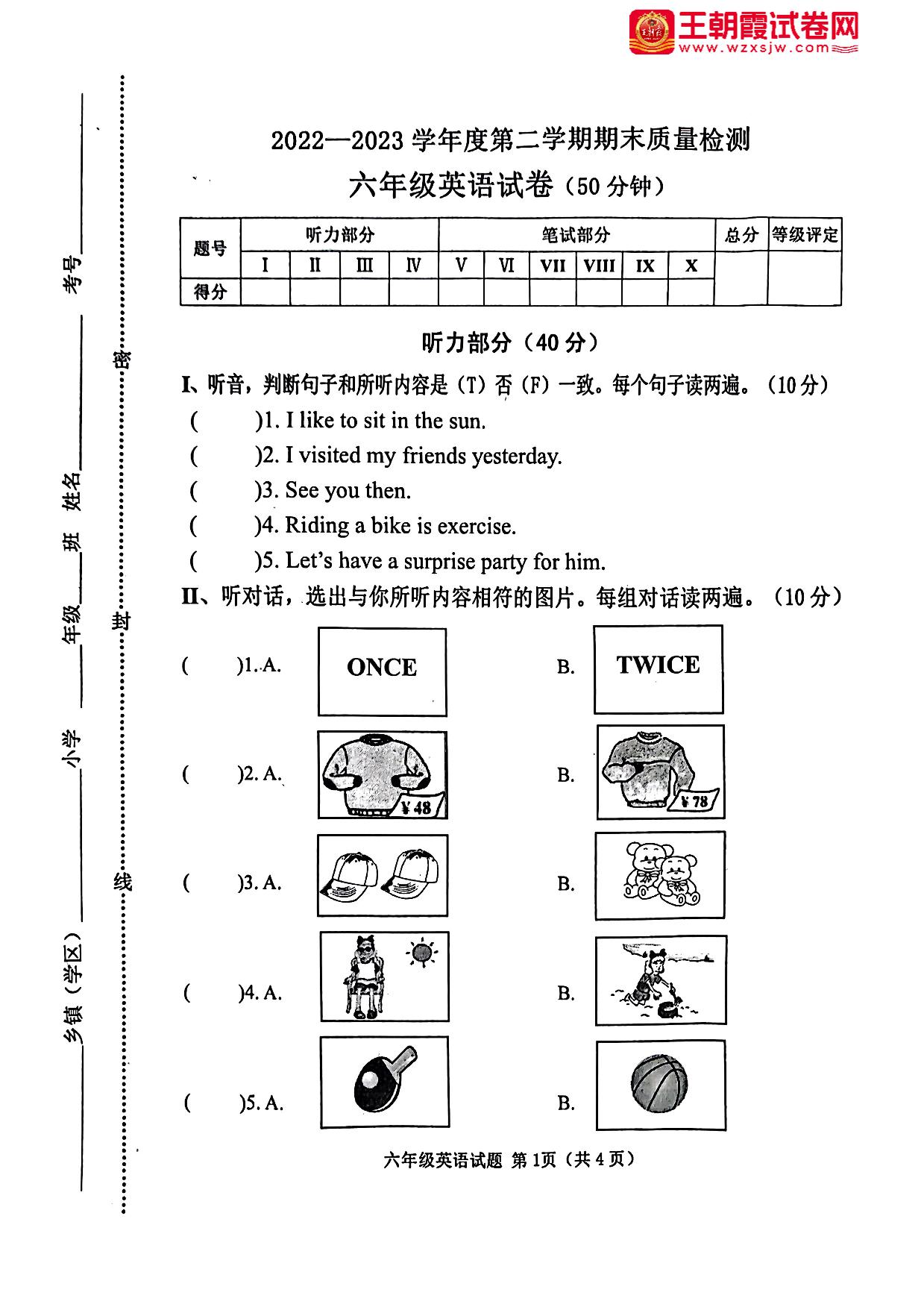 河北省秦皇岛市昌黎县2022-2023学年度第二学期期末质量检测试题六年级英语(冀教版)