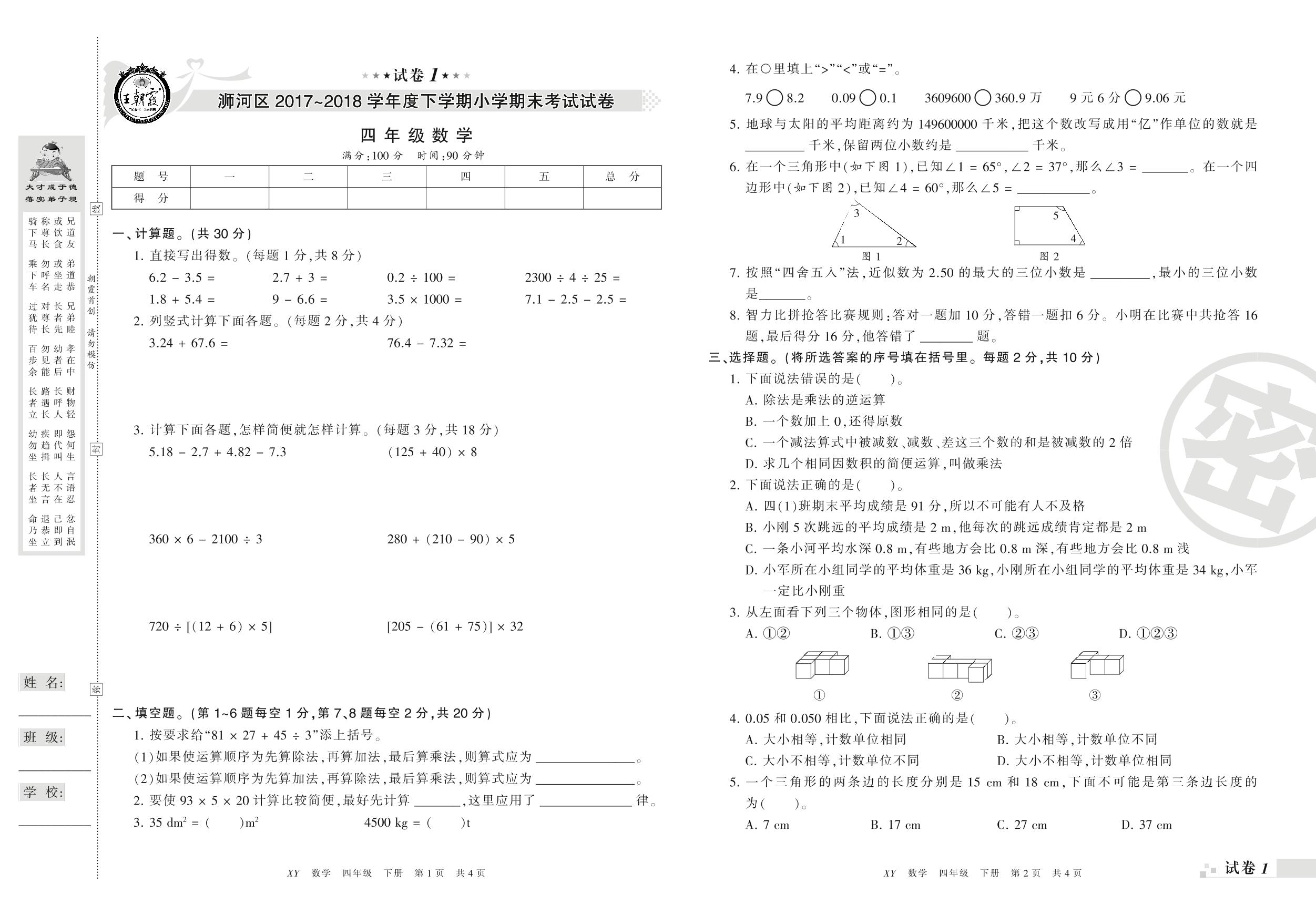 2017-2018学年第二学期信阳市浉河区四年级数学试卷(人教版)【1】