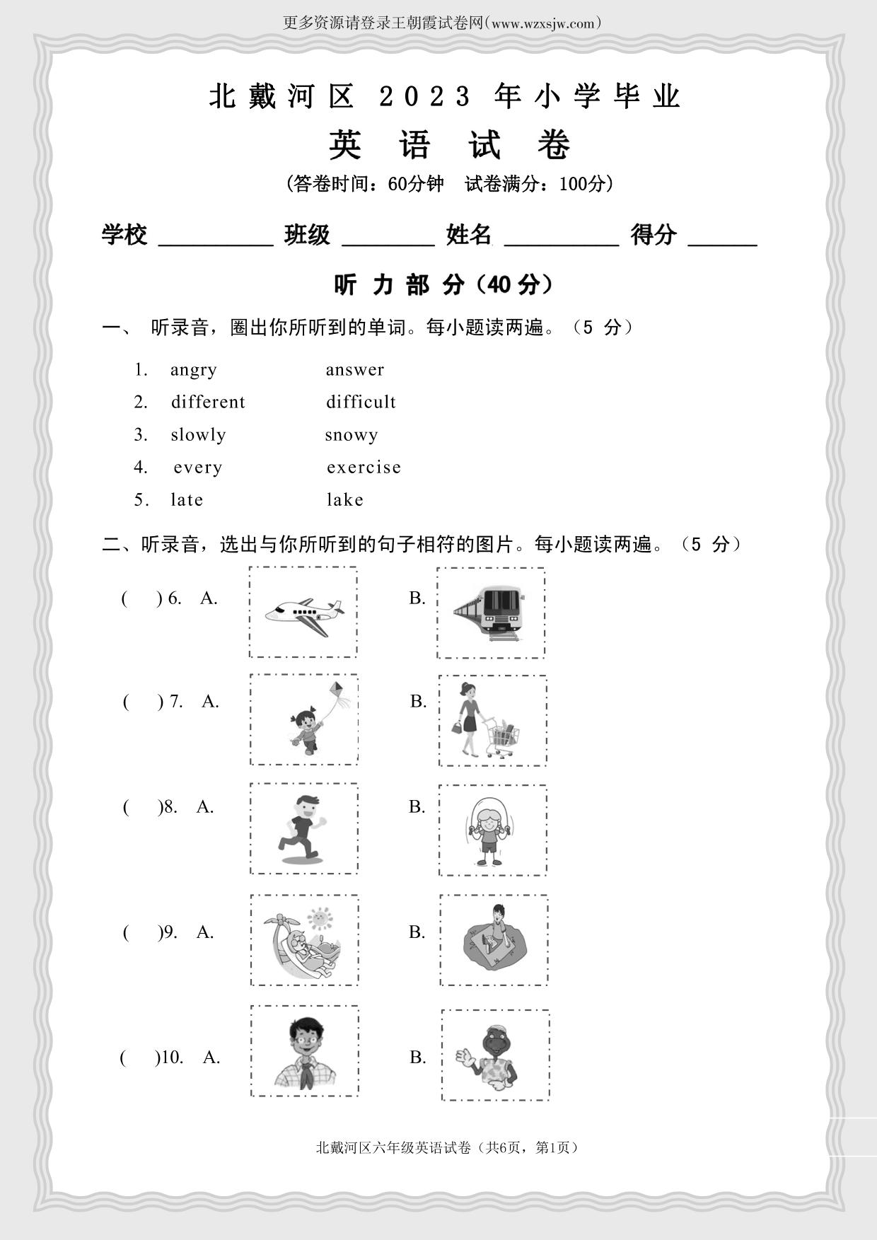 河北省秦皇岛市北戴河区2022-2023学年度第二学期小学毕业试卷六年级英语(冀教版)【无听力音频】