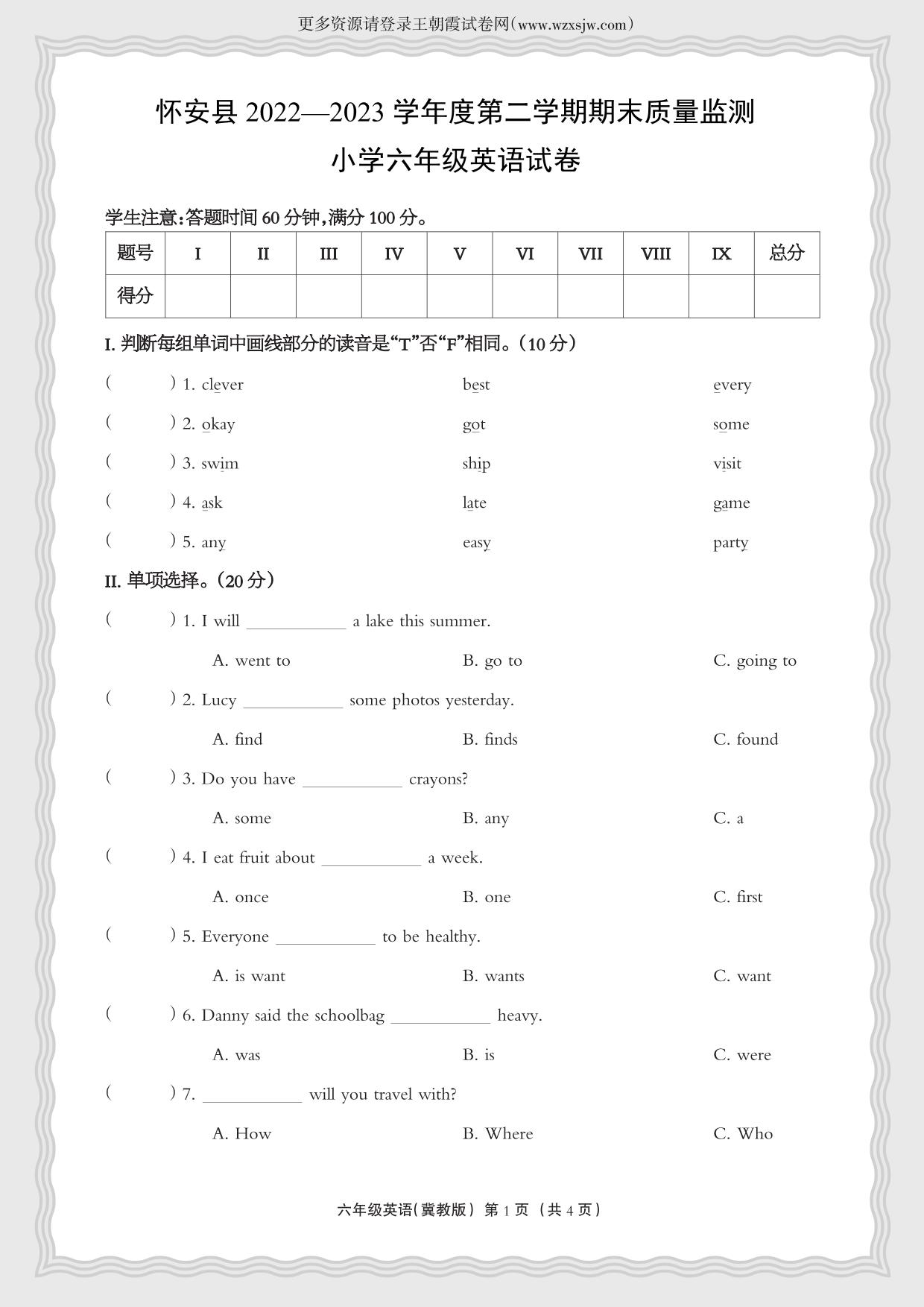 河北省张家口市怀安县2022-2023学年度第二学期期末质量检测试卷六年级英语(冀教版)
