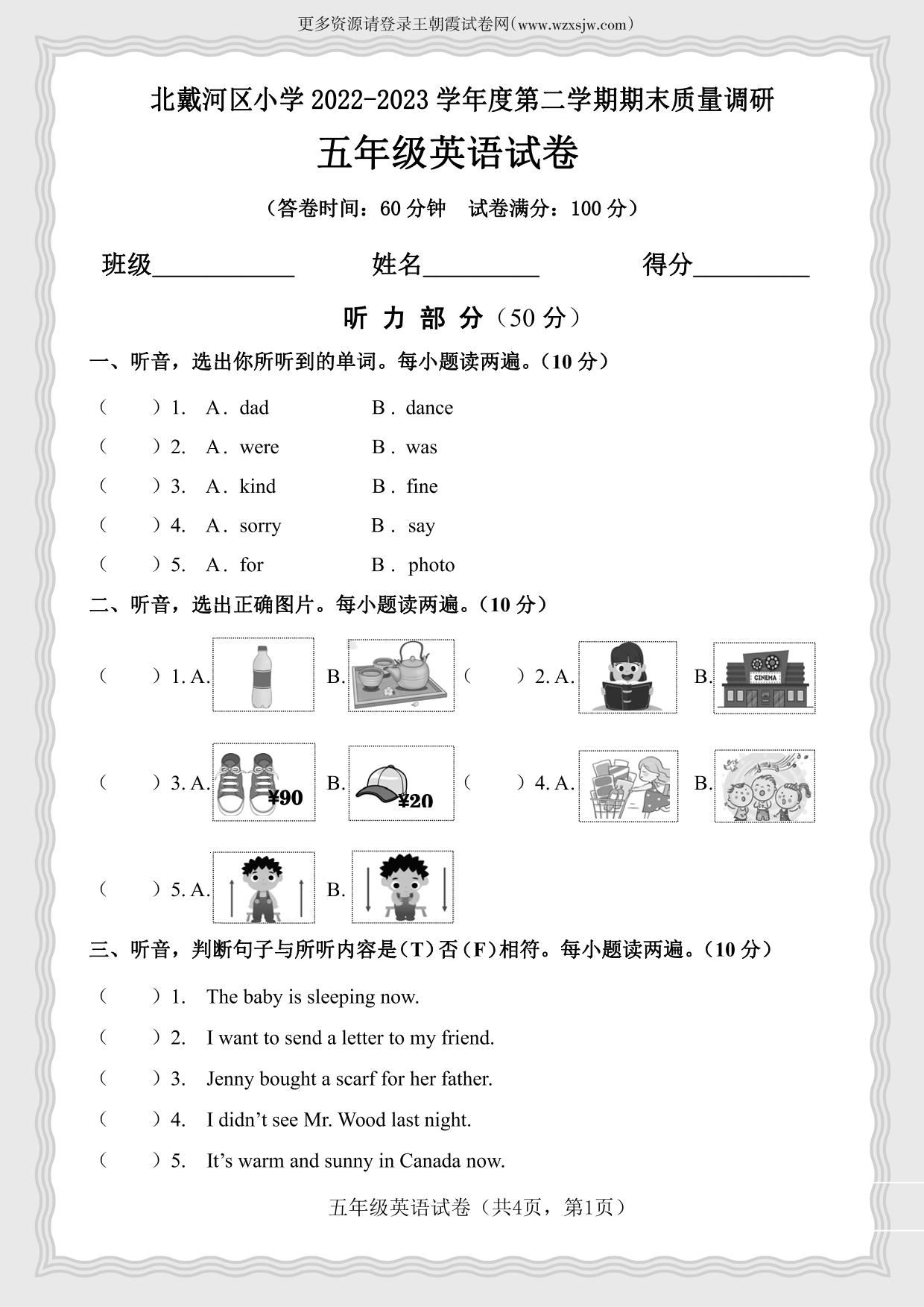 河北省秦皇岛市北戴河区2022-2023学年度第二学期期末质量调研试卷五年级英语(冀教版)【无听力音频】