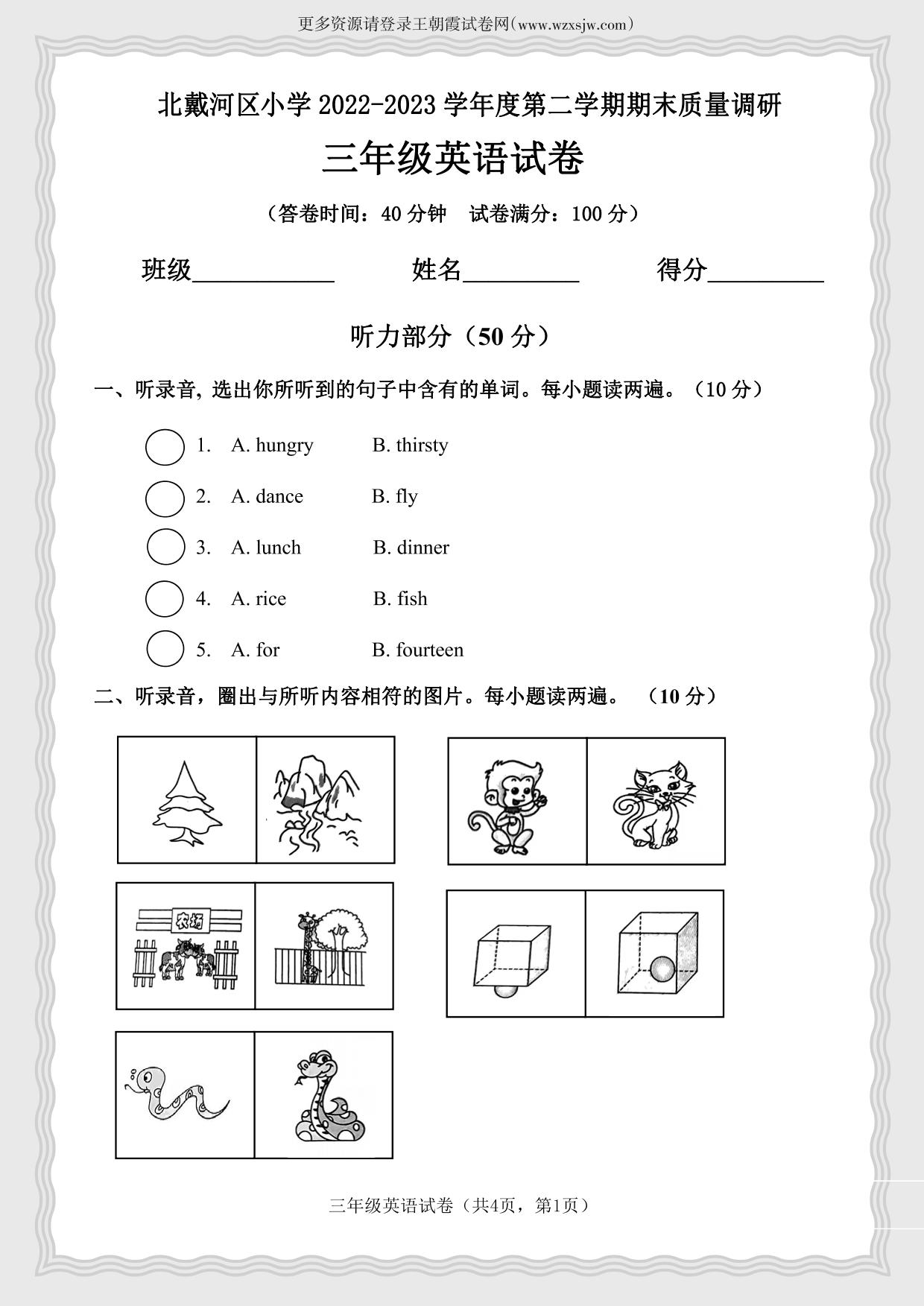 河北省秦皇岛市北戴河区2022-2023学年度第二学期期末质量调研试卷三年级英语(冀教版)【无听力音频】