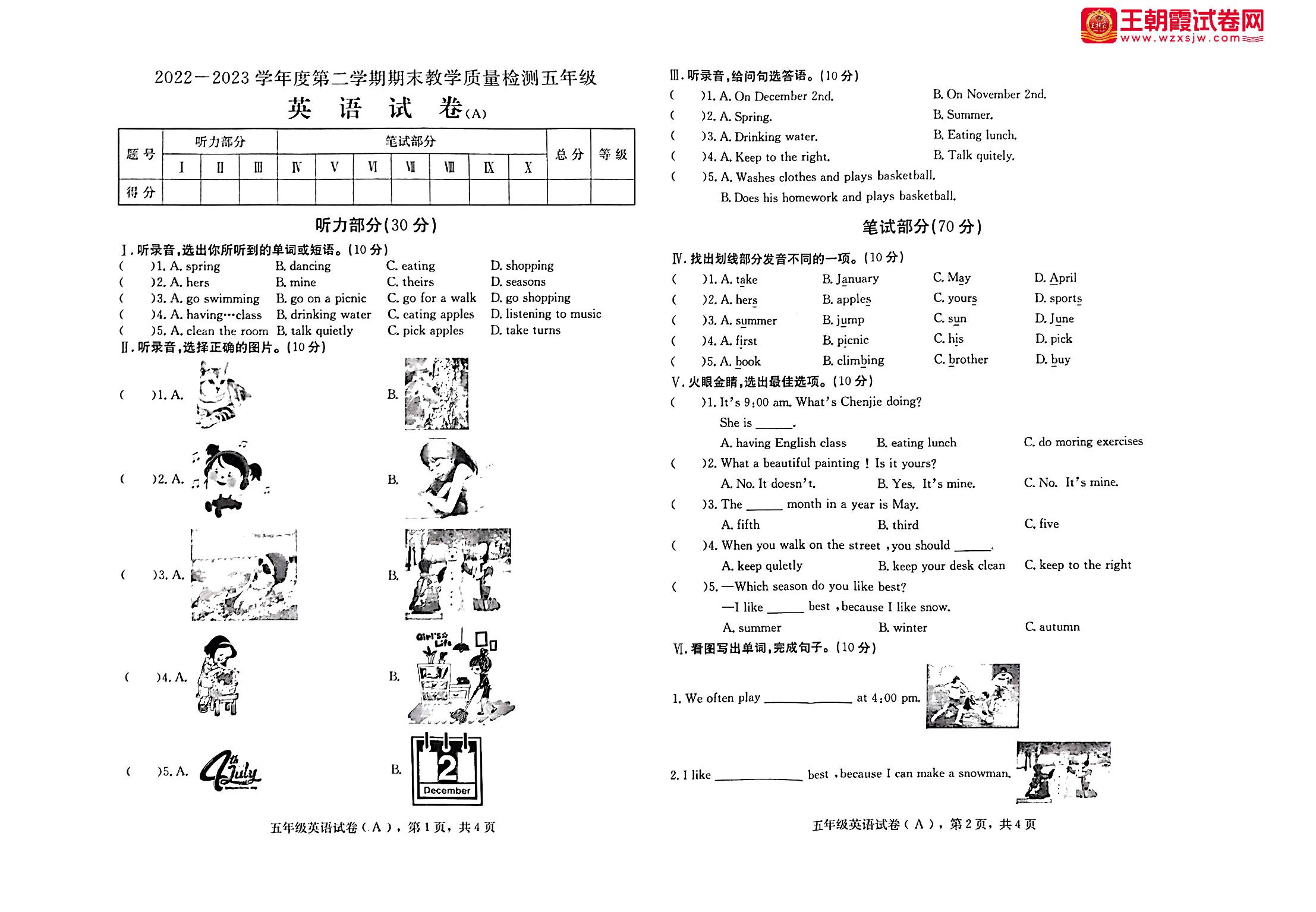河北省衡水市枣强县2022-2023学年第二学期期末教学质量检测五年级英语(人教PEP版)
