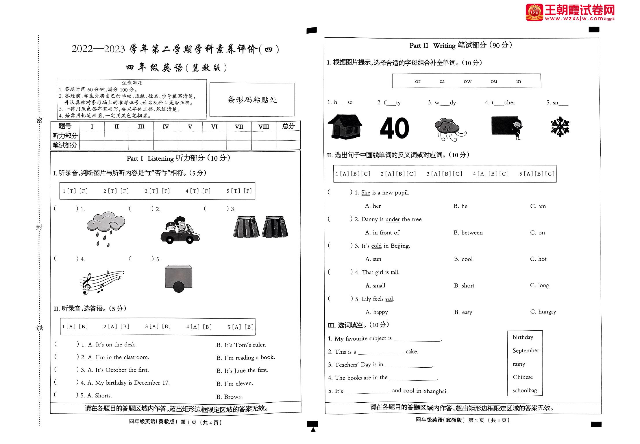 河北省衡水市深州市2022-2023学年第二学期期末学科素养评价四年级英语(冀教版)
