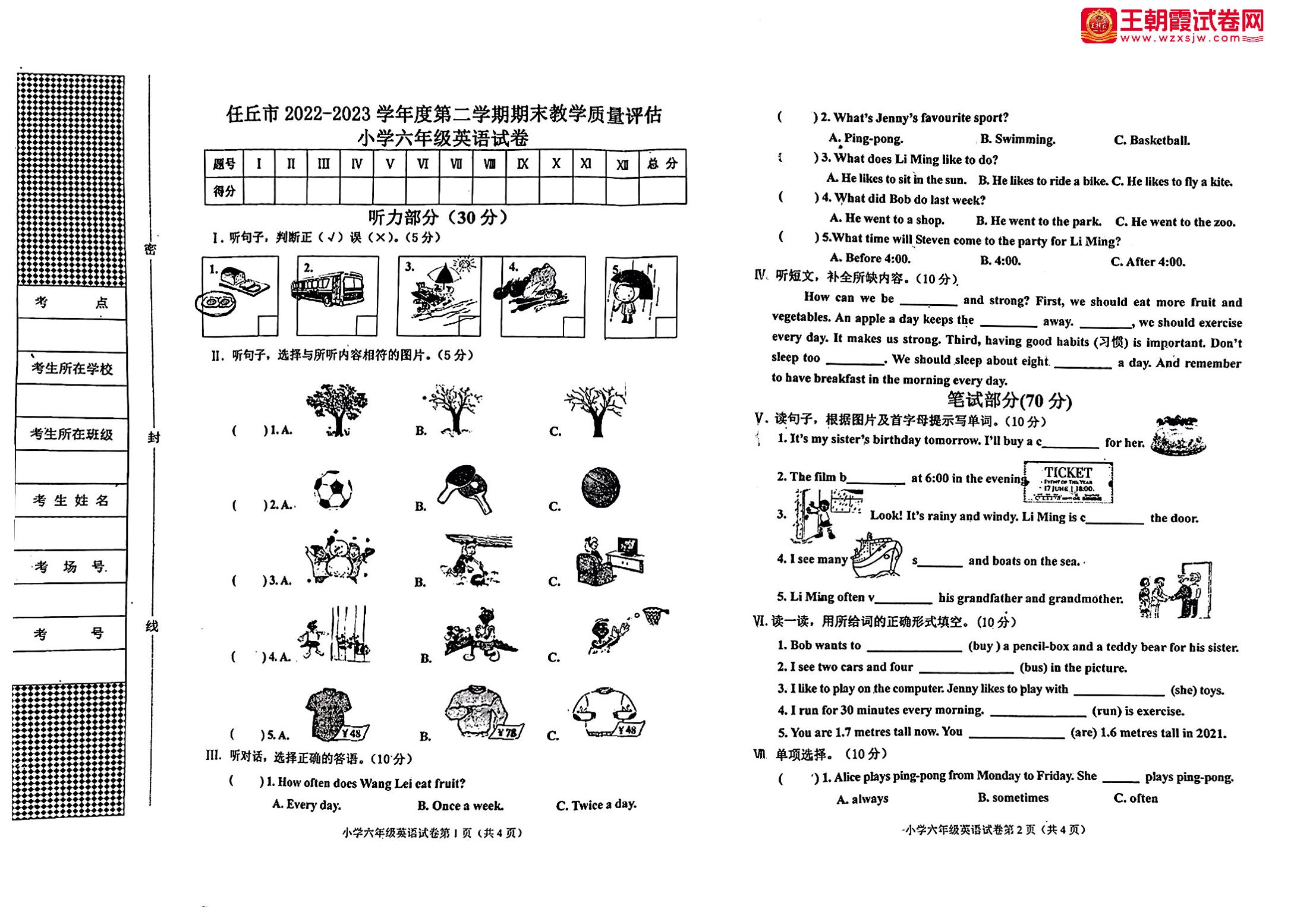河北省沧州市任丘市2022-2023学年度第二学期期末教学质量评估试卷六年级英语(冀教版)【无听力音频】