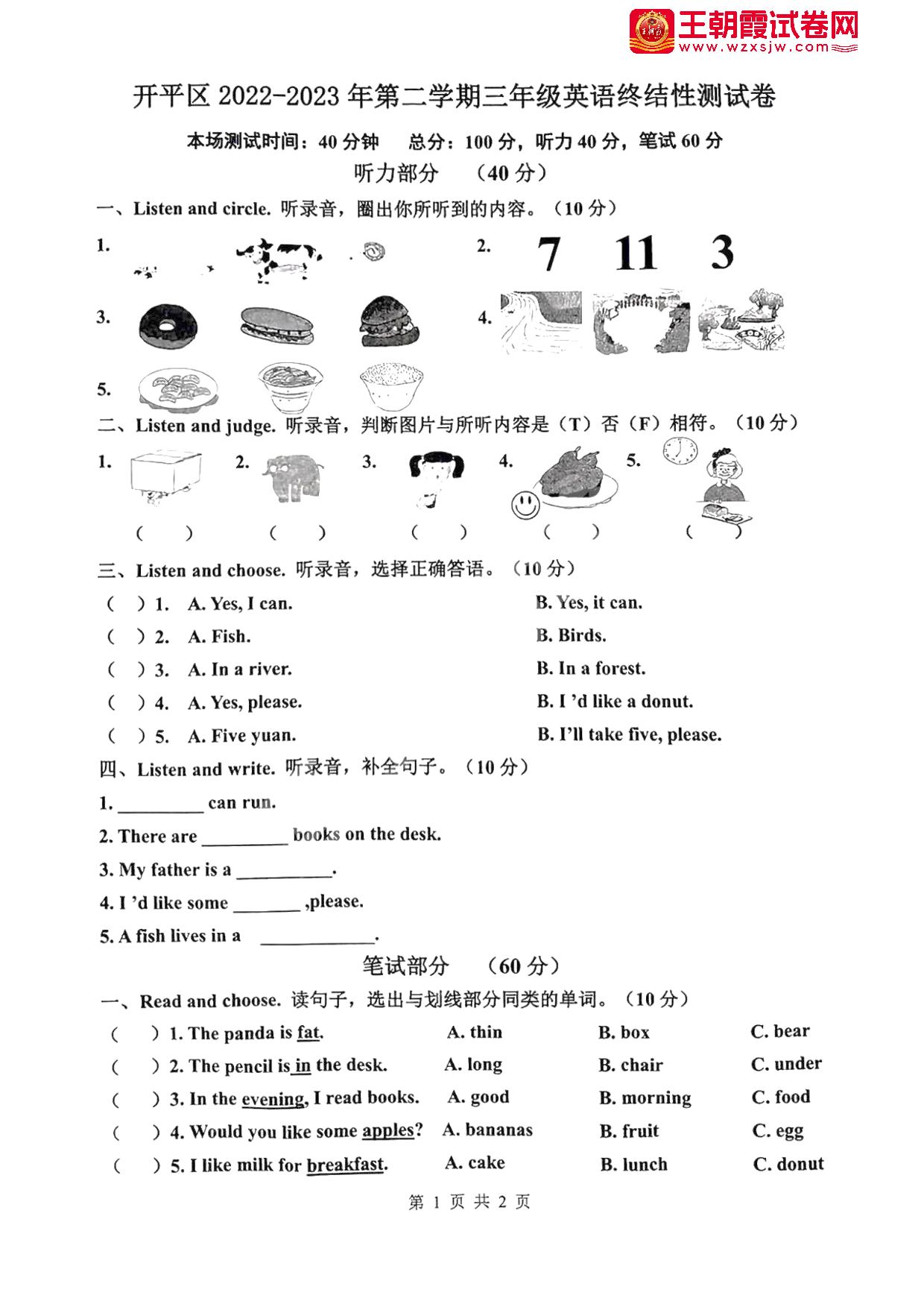 河北省唐山市开平区2022-2023学年第二学期期末终结性测试卷三年级英语(冀教版)【无听力音频】