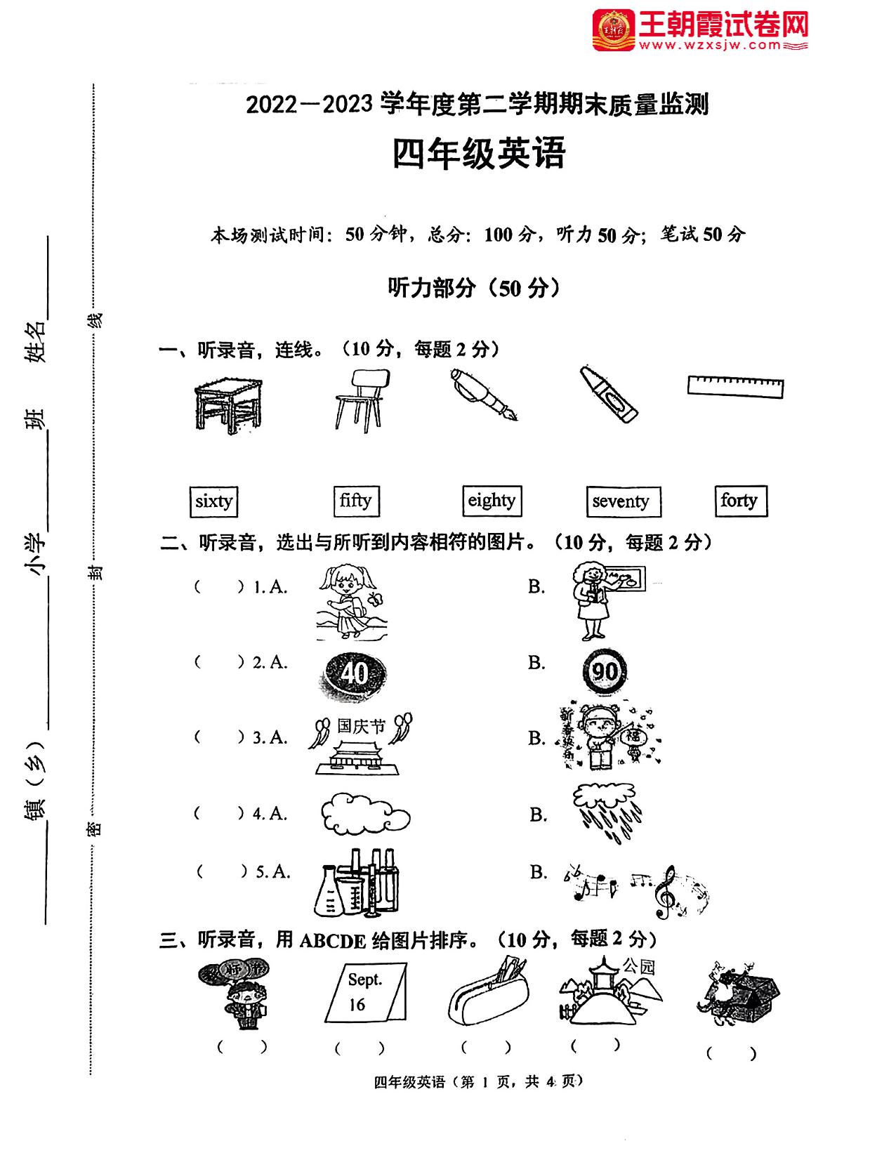 河北省唐山市丰润区2022-2023学年第第二学期期末质量监测四年级英语(冀教版)