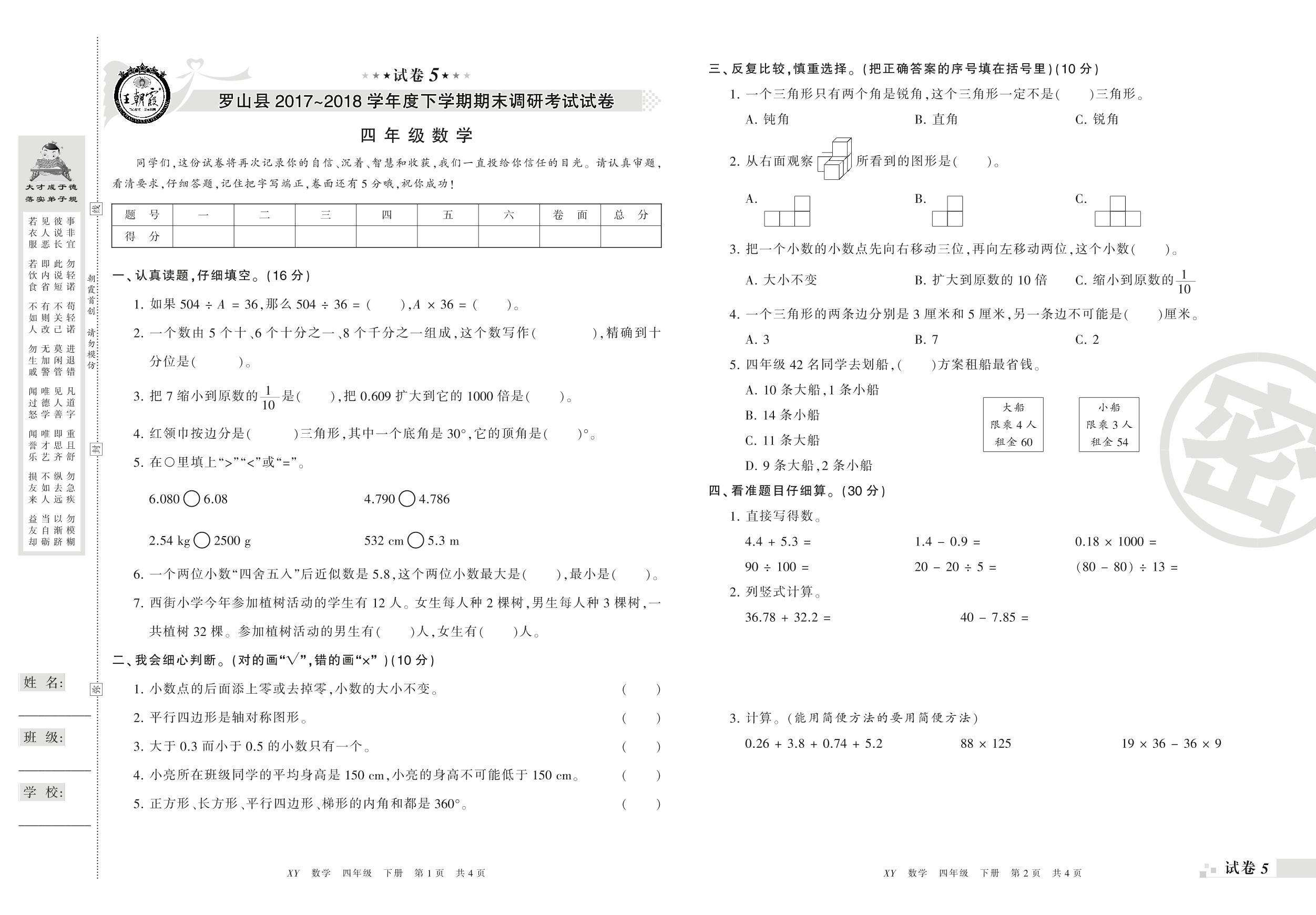 2017-2018学年第二学期信阳市罗山县四年级数学试卷(人教版)【5】