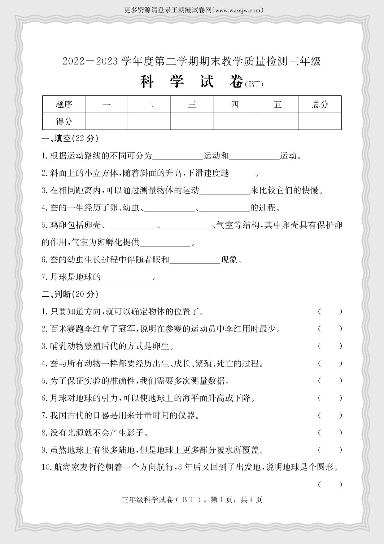 河北省沧州市泊头市2022-2023学年度第二学期期末教学质量检测试卷三年级科学(教科版)