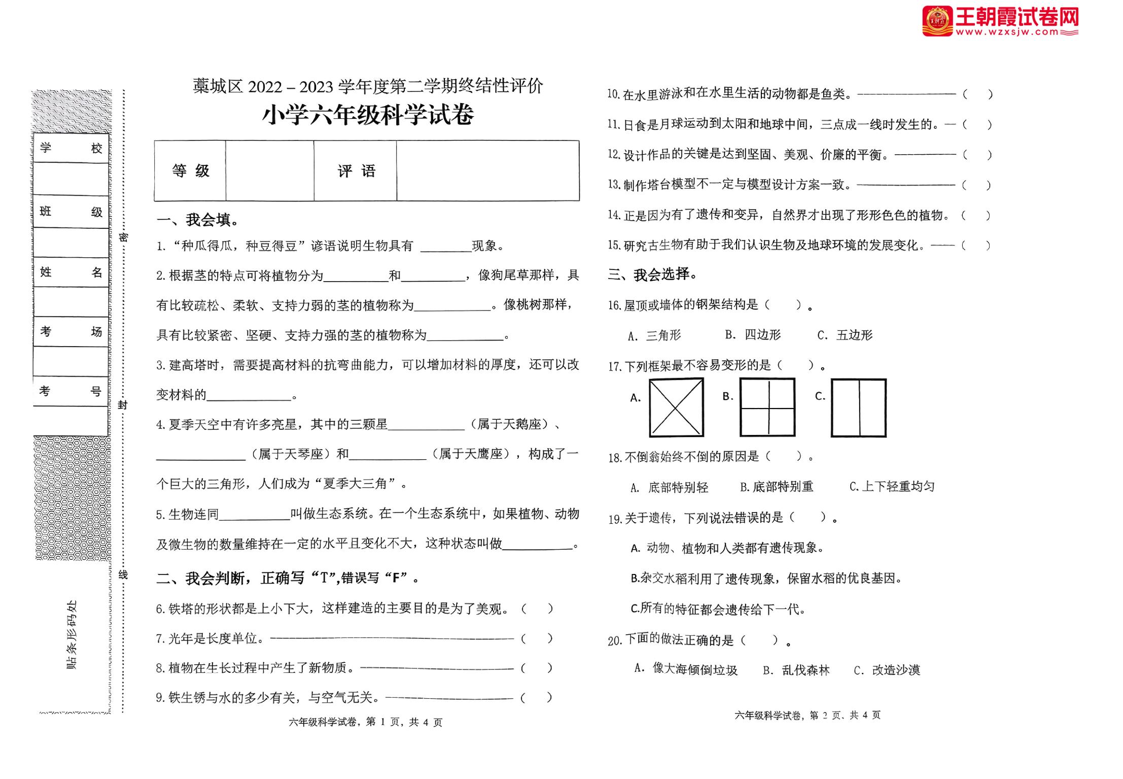 河北省石家庄市藁城区2022-2023学年度第二学期终结性评价试卷六年级科学(冀人版)