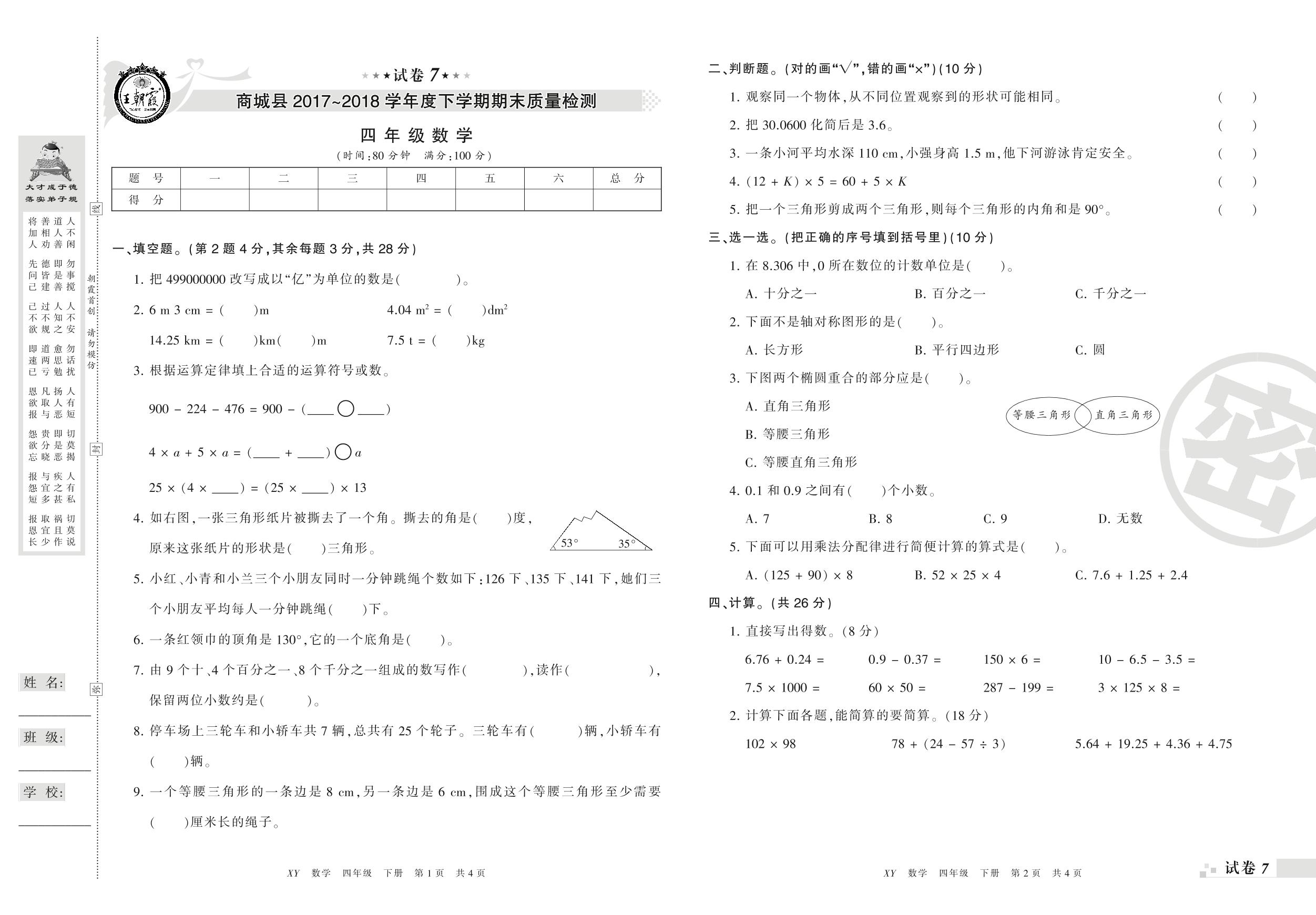 2017-2018学年第二学期信阳市商城县四年级数学试卷(人教版)【7】