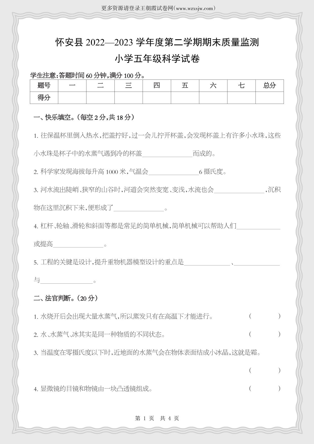 河北省张家口市怀安县2022-2023学年度第二学期期末质量检测试卷五年级科学(冀人版)