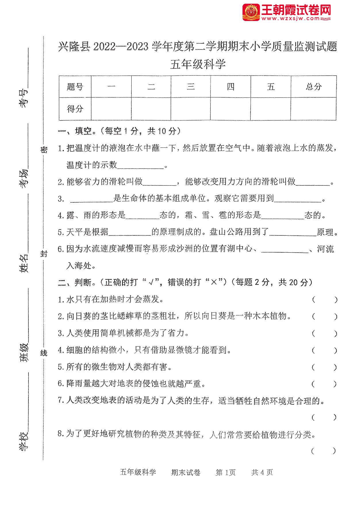 河北省承德市兴隆县2022-2023学年度第二学期期末小学质量监测试题五年级科学(冀人版)