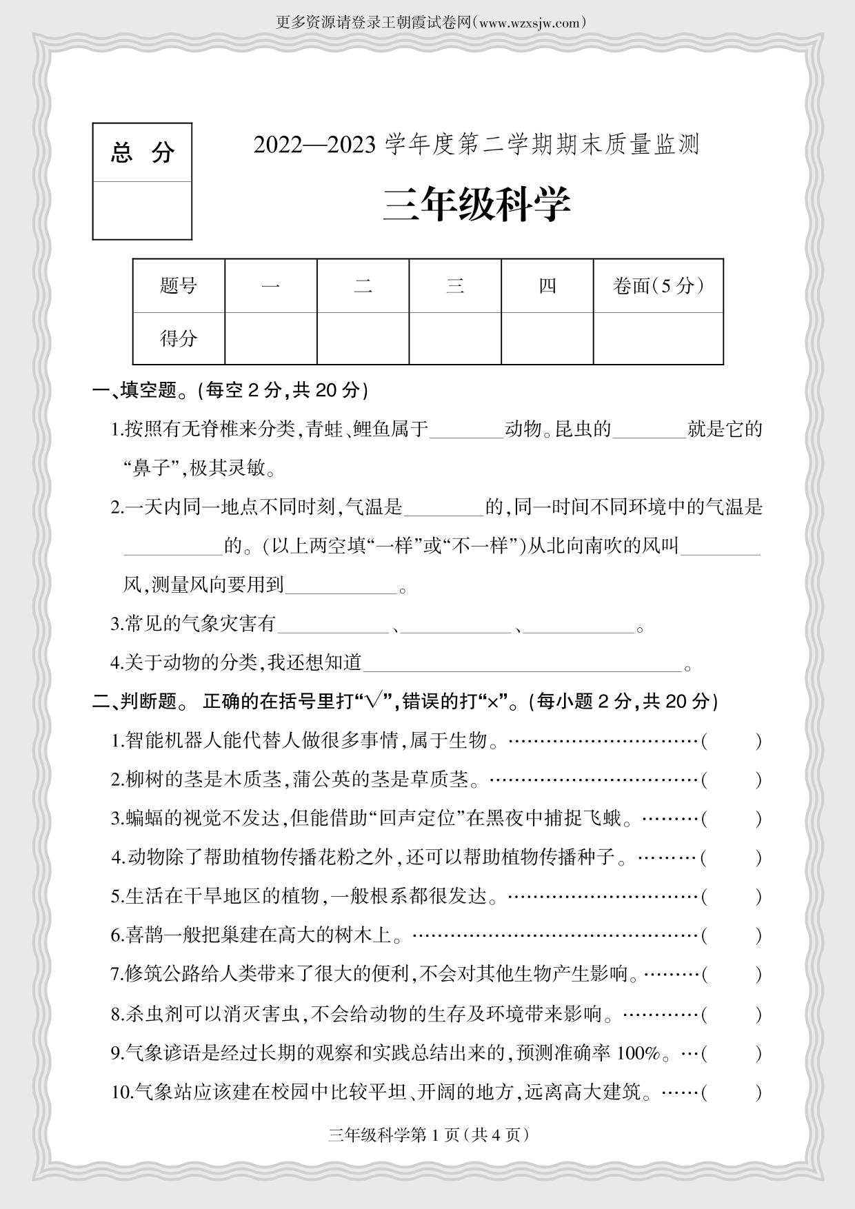 河北省保定市定州市2022-2023学年度第二学期期末质量检测三年级科学(冀人版)