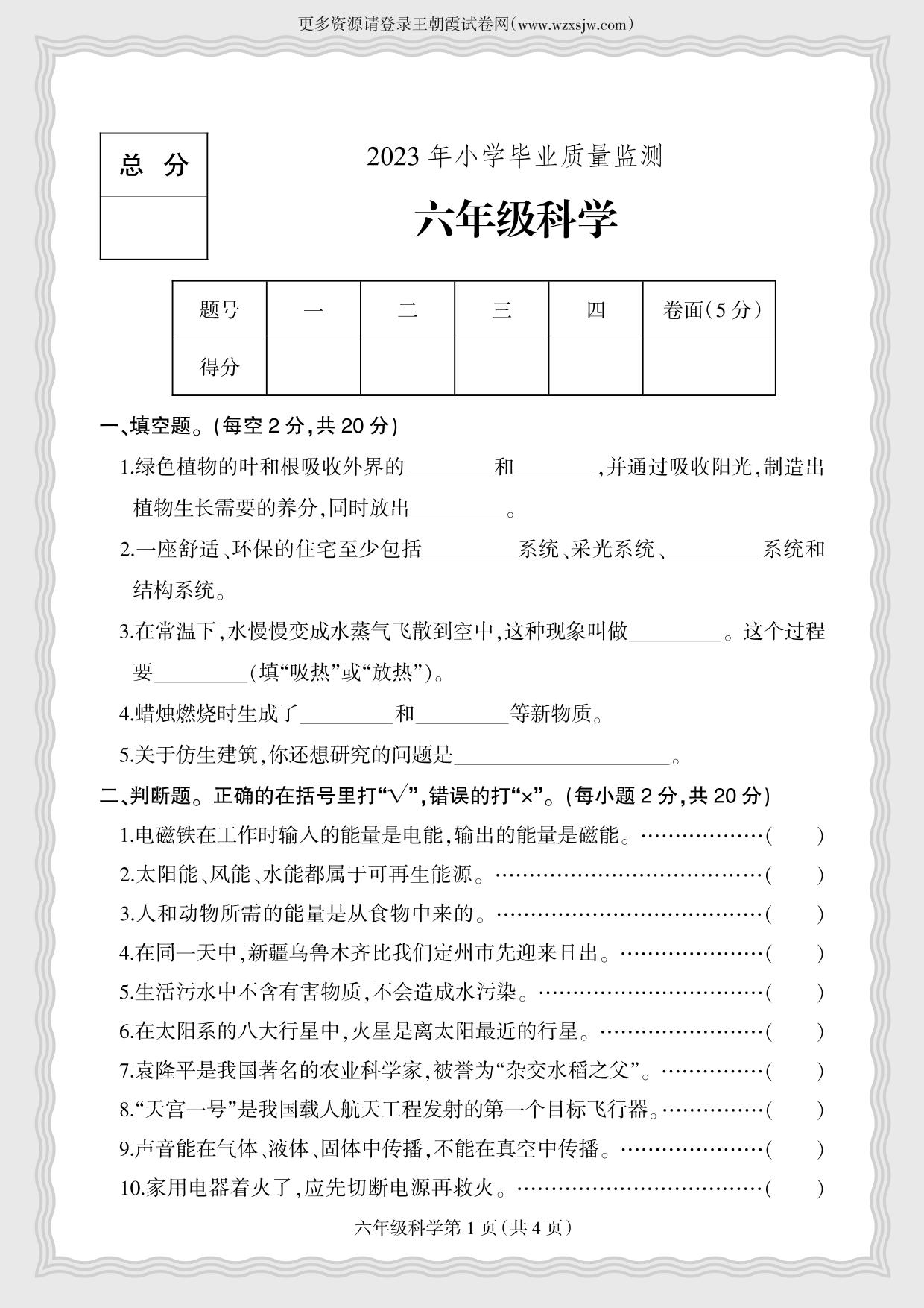 河北省保定市定州市2022-2023学年度第二学期毕业质量检测六年级科学(冀人版)