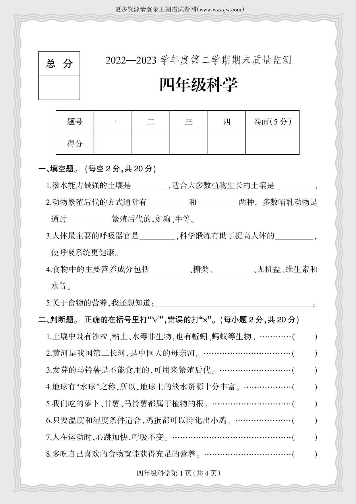 四年级科学冀人版下册期末卷