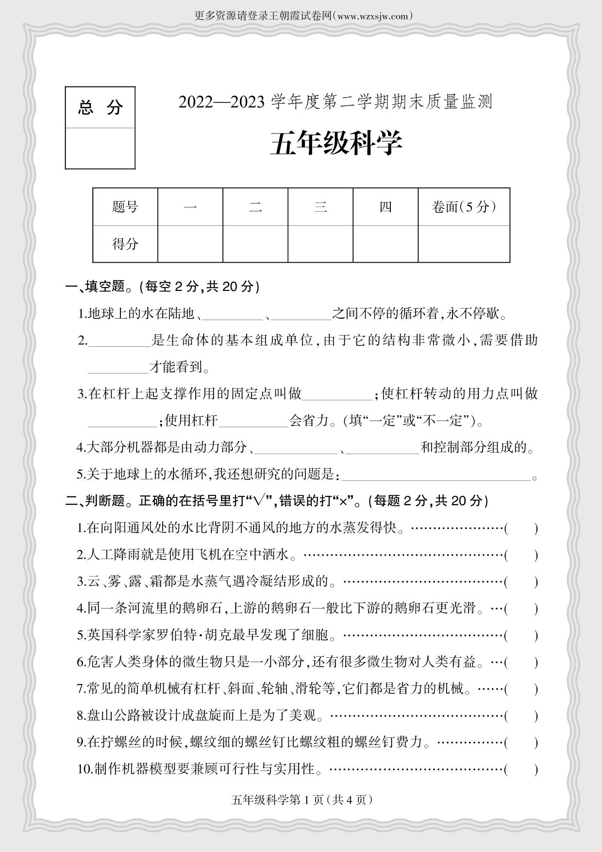 河北省保定市定州市2022-2023学年度第二学期期末质量检测五年级科学(冀人版)
