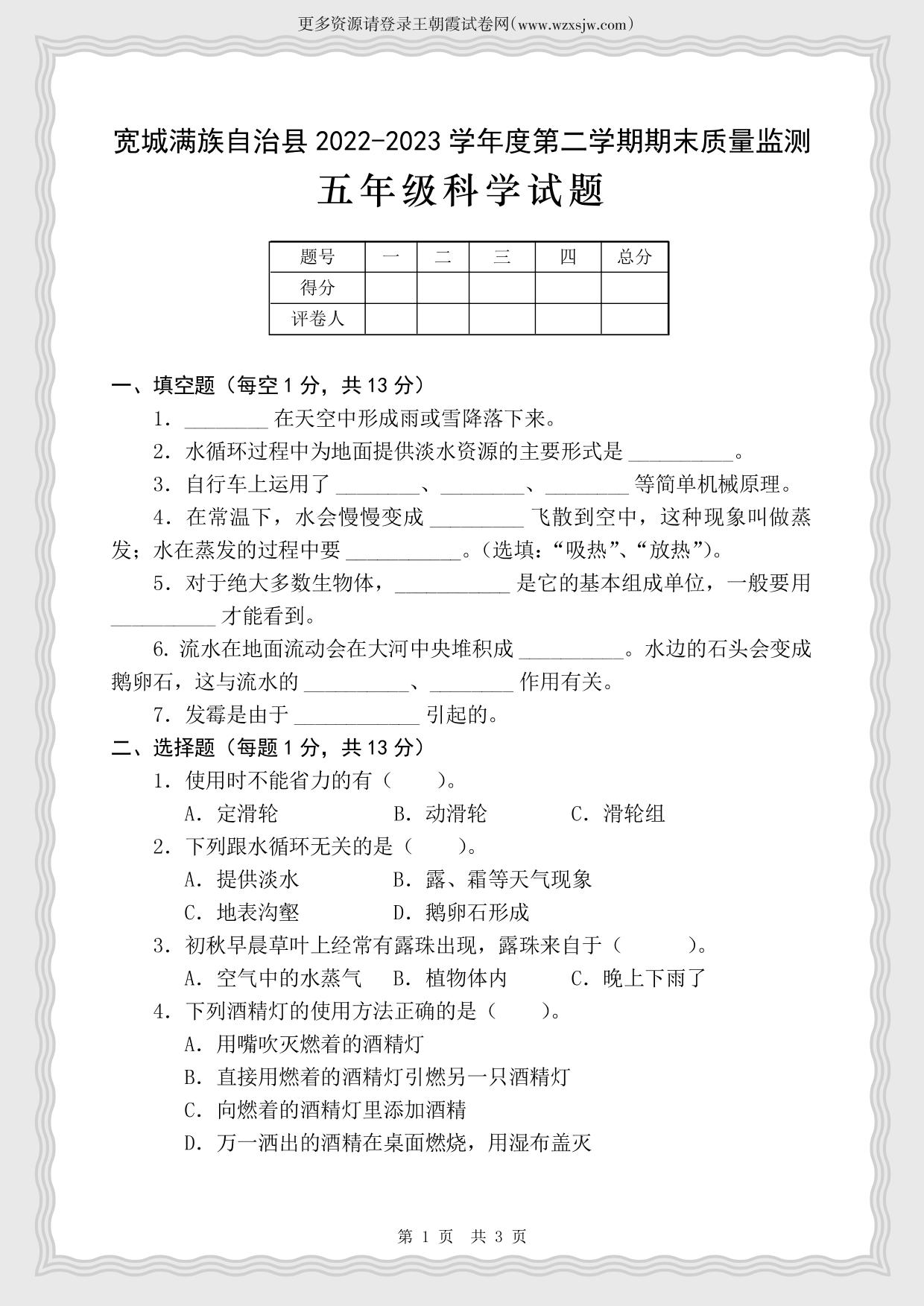 河北省承德市宽城满族自治县2022-2023学年度第二学期期末质量监测试题五年级科学(冀人版)