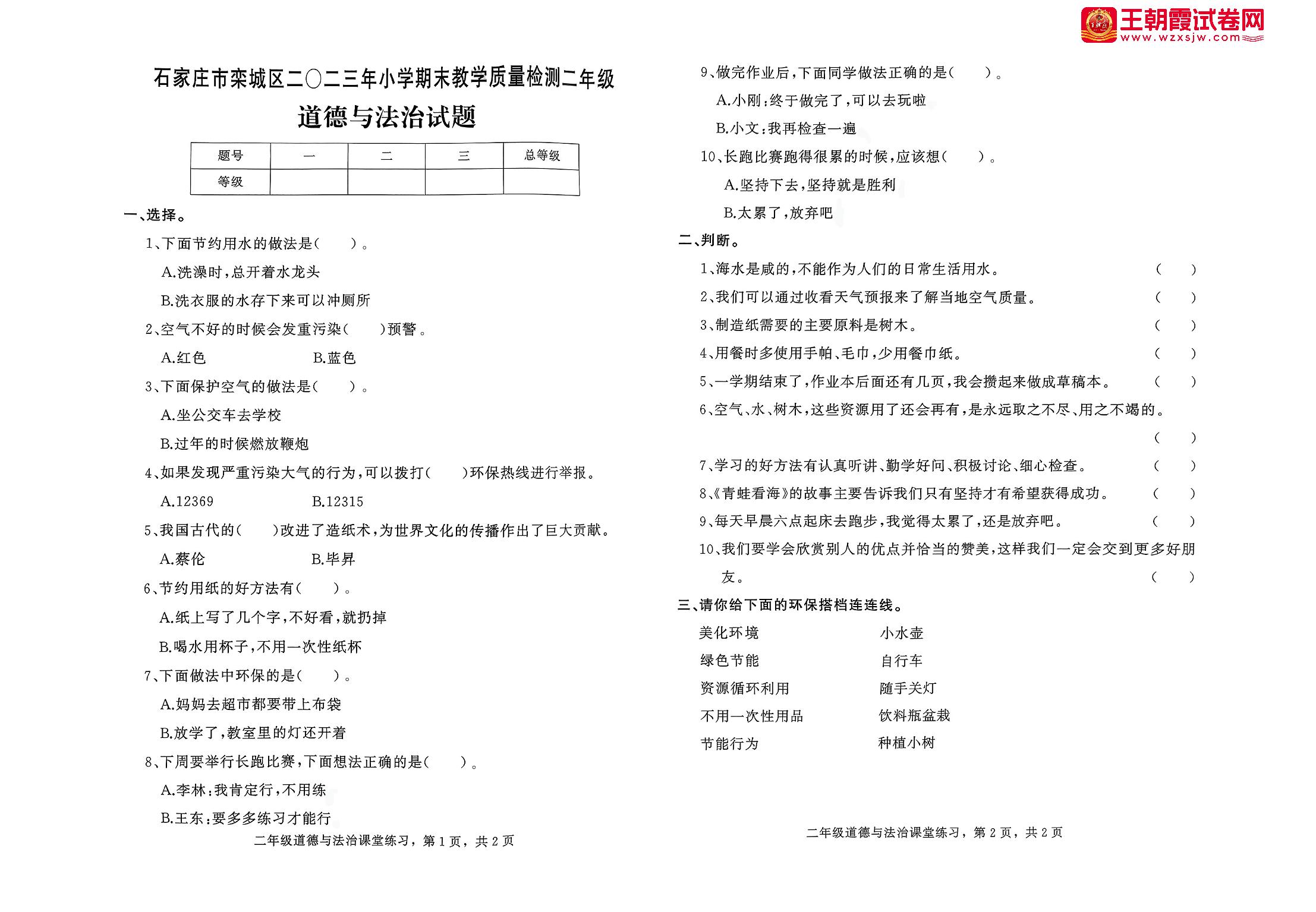 河北省石家庄市栾城区2022-2023学年第二学期期末教学质量检测试题二年级道德与法治(人教版)
