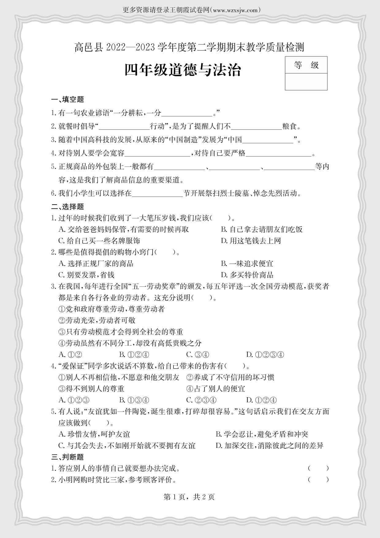 河北省石家庄市高邑县2022-2023学年度第二学期期末教学质量检测试题四年级道德与法治(人教版)
