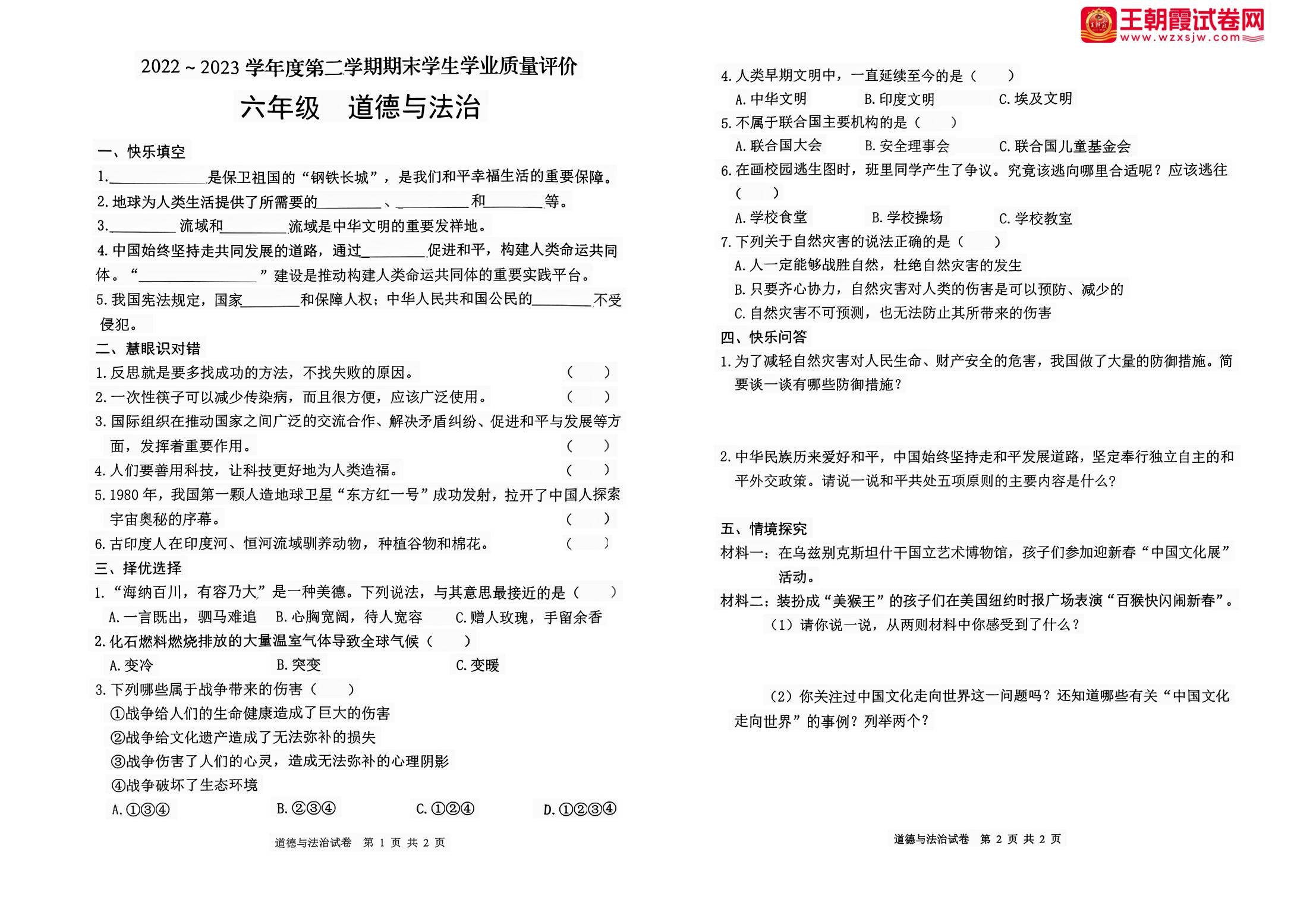 河北省石家庄市栾城区2022-2023学年度第二学期期末学生学业质量评价六年级道德与法治(人教版)