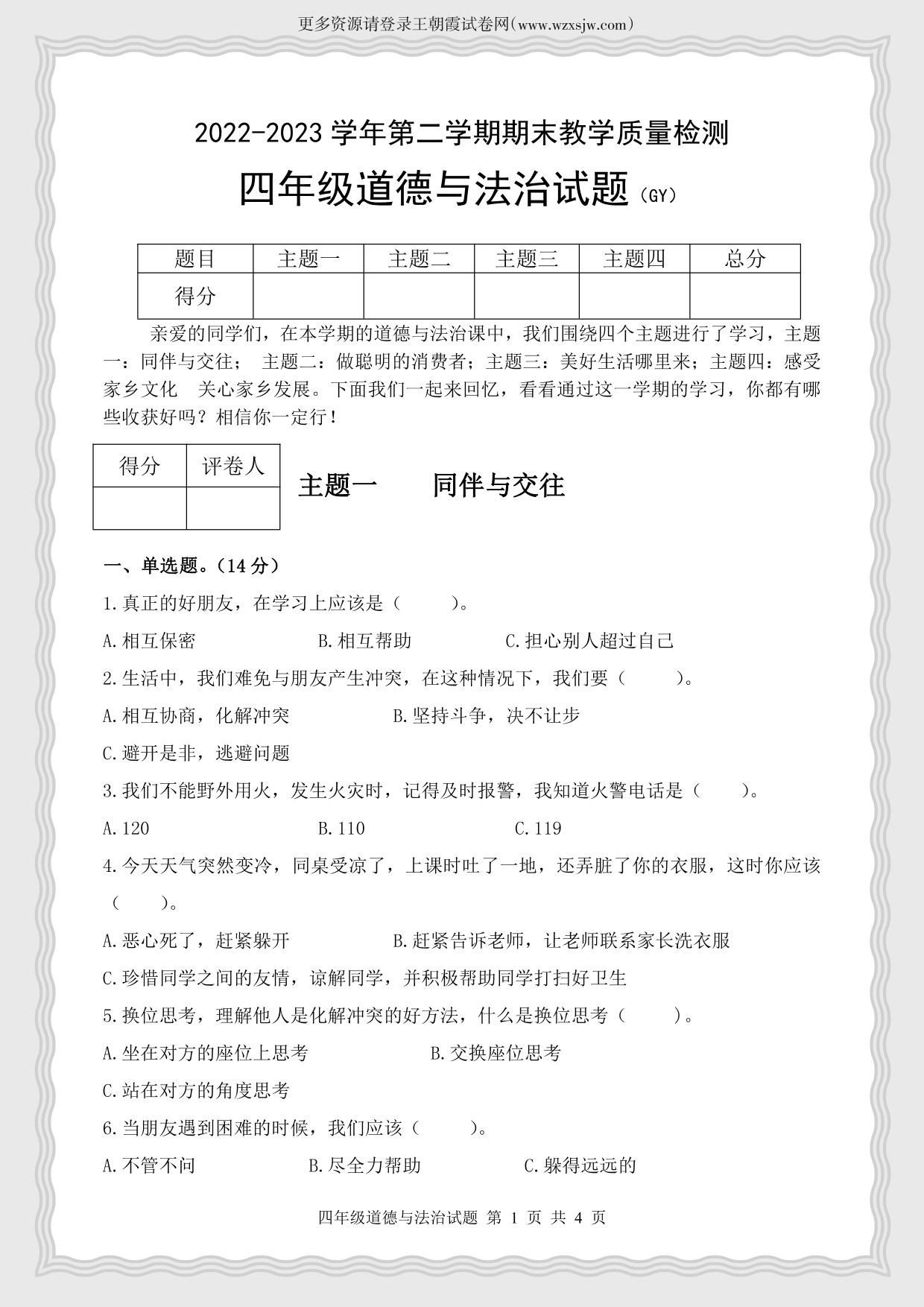 河北省保定市高阳县2022-2023学年第二学期期末教学质量检测试题四年级道德与法治(人教版)