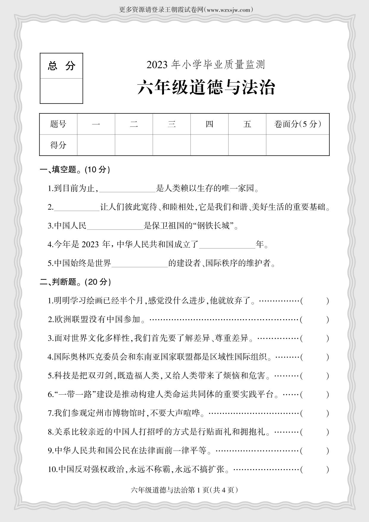 河北省保定市定州市2022-2023学年度第二学期毕业质量检测六年级道德与法治(人教版)